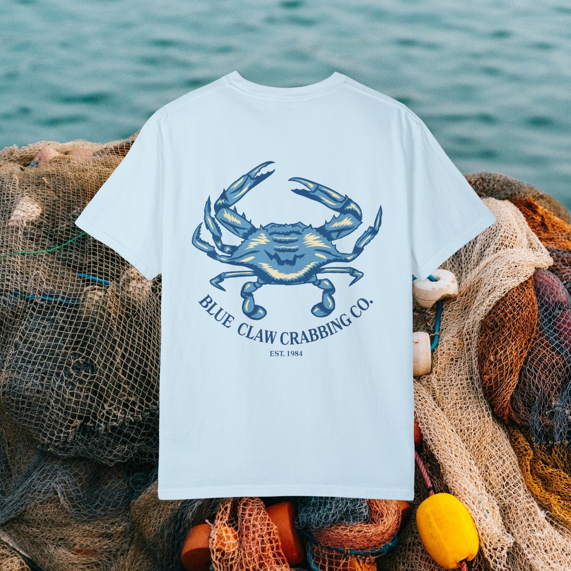 Unisex Blue Claw Crabbing Co. T-Shirt. This hand-drawn design captures a coastal Maryland vibe.