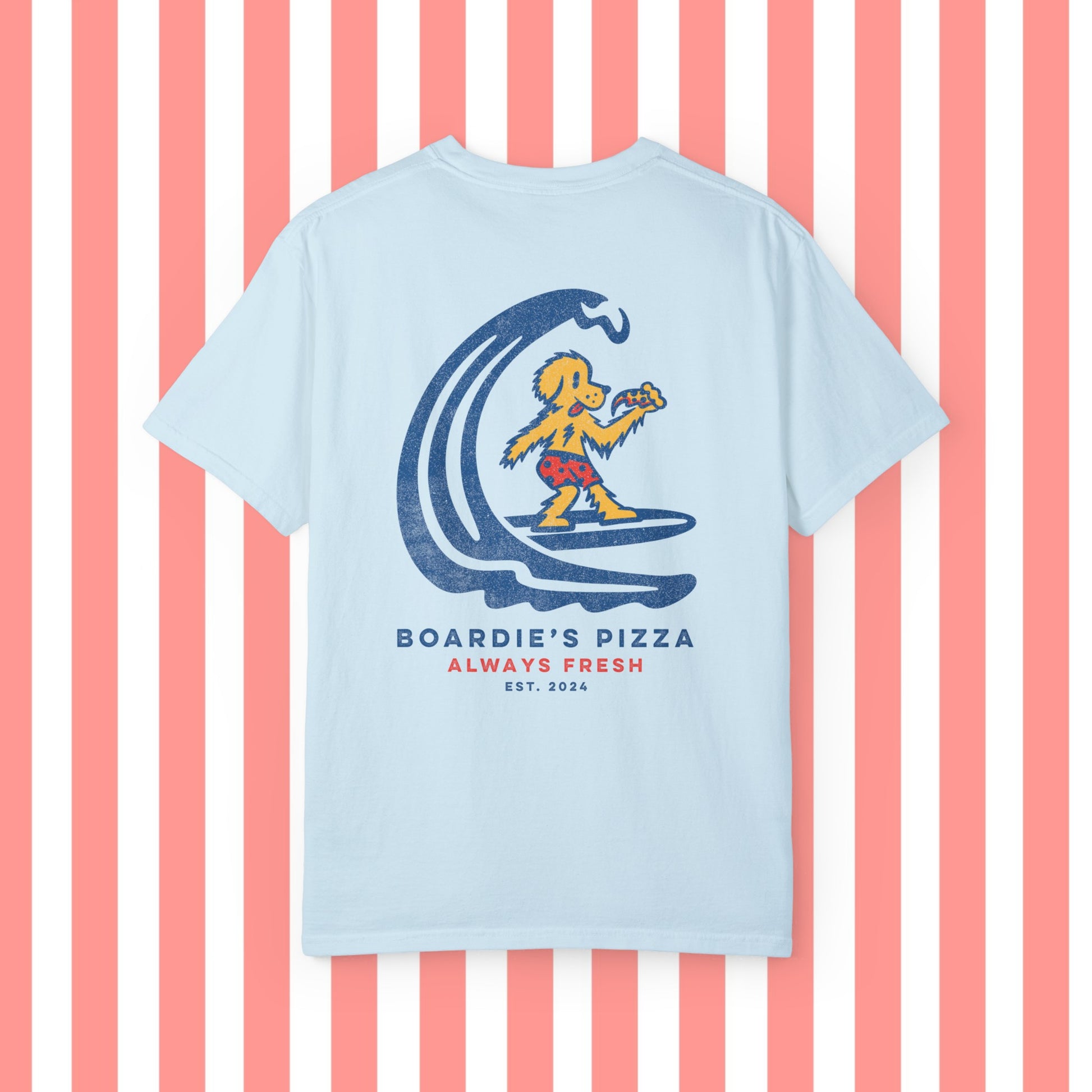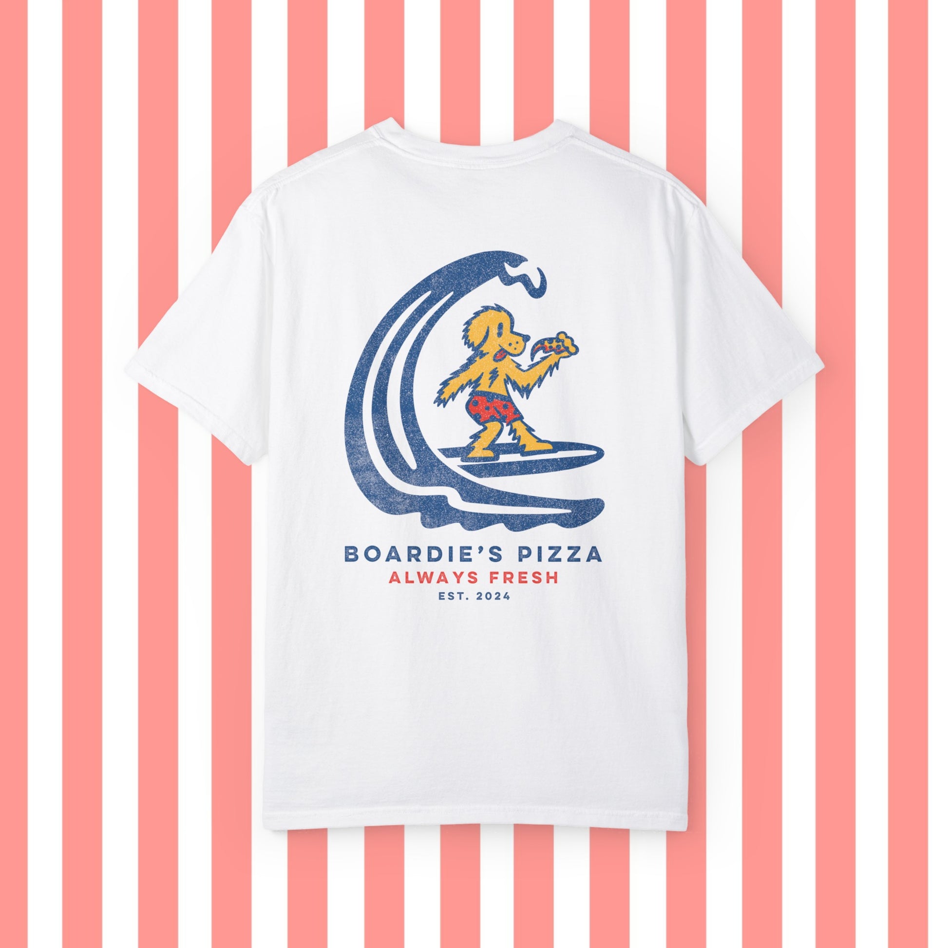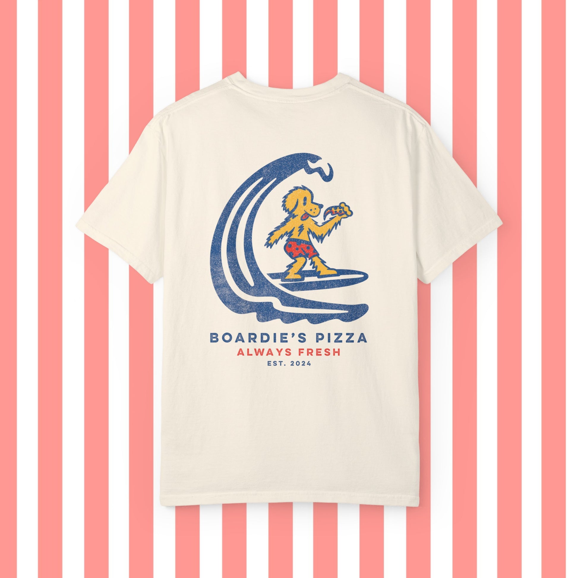 Unisex Boardie's Pizza T-Shirt. This original hand-drawn design is based on a fictional boardwalk pizza shop, with a golden retriever mascot.