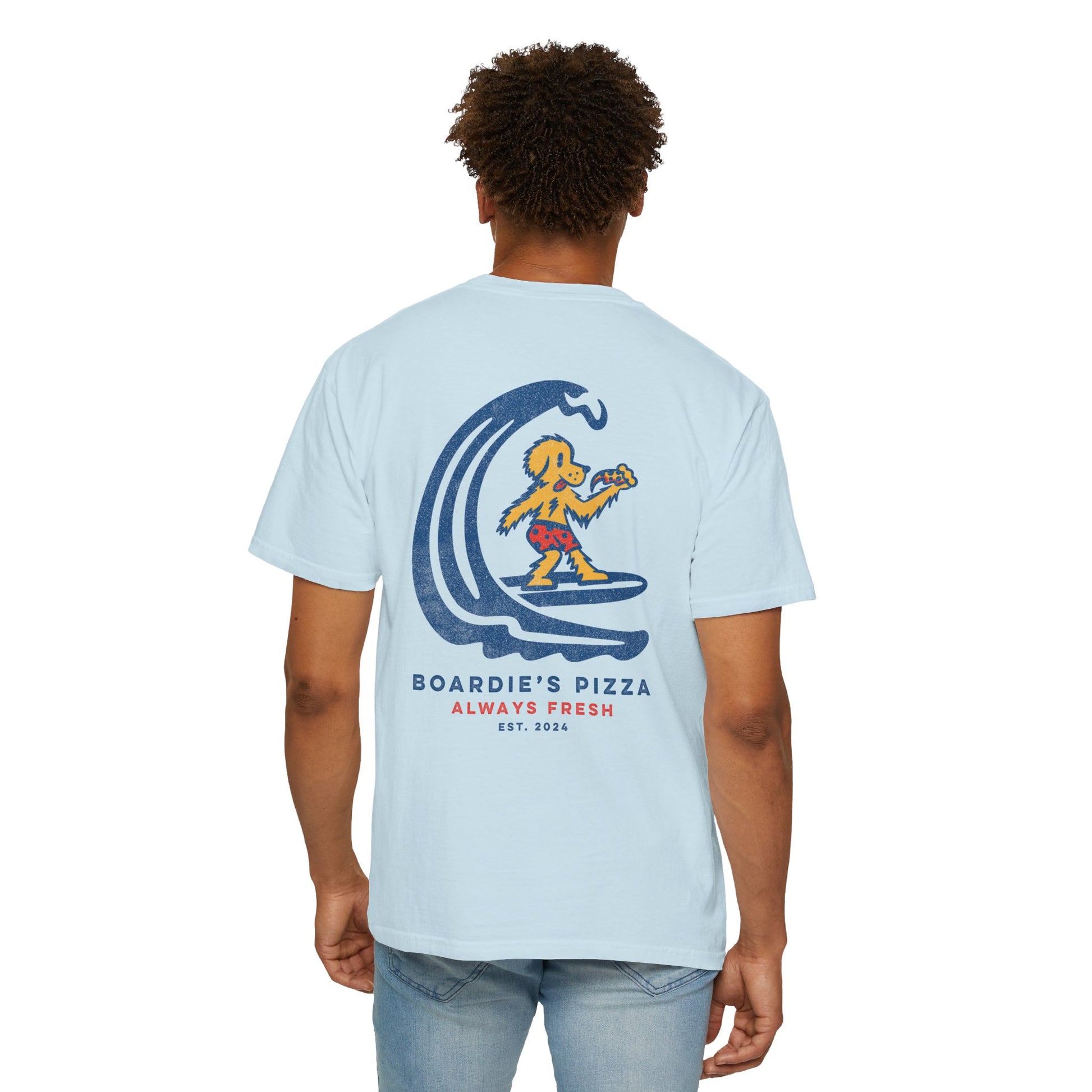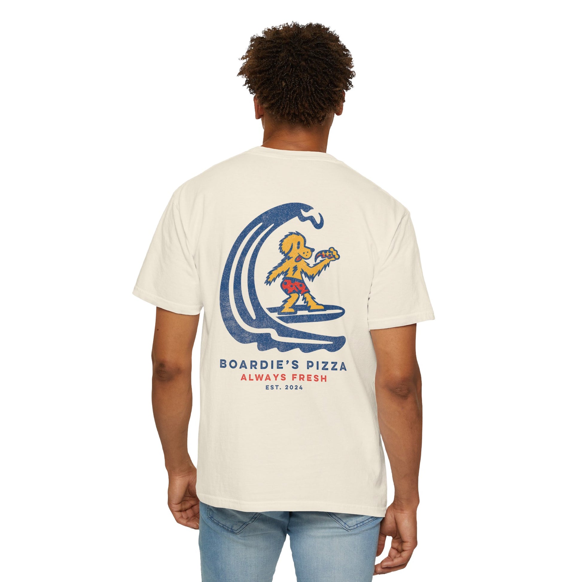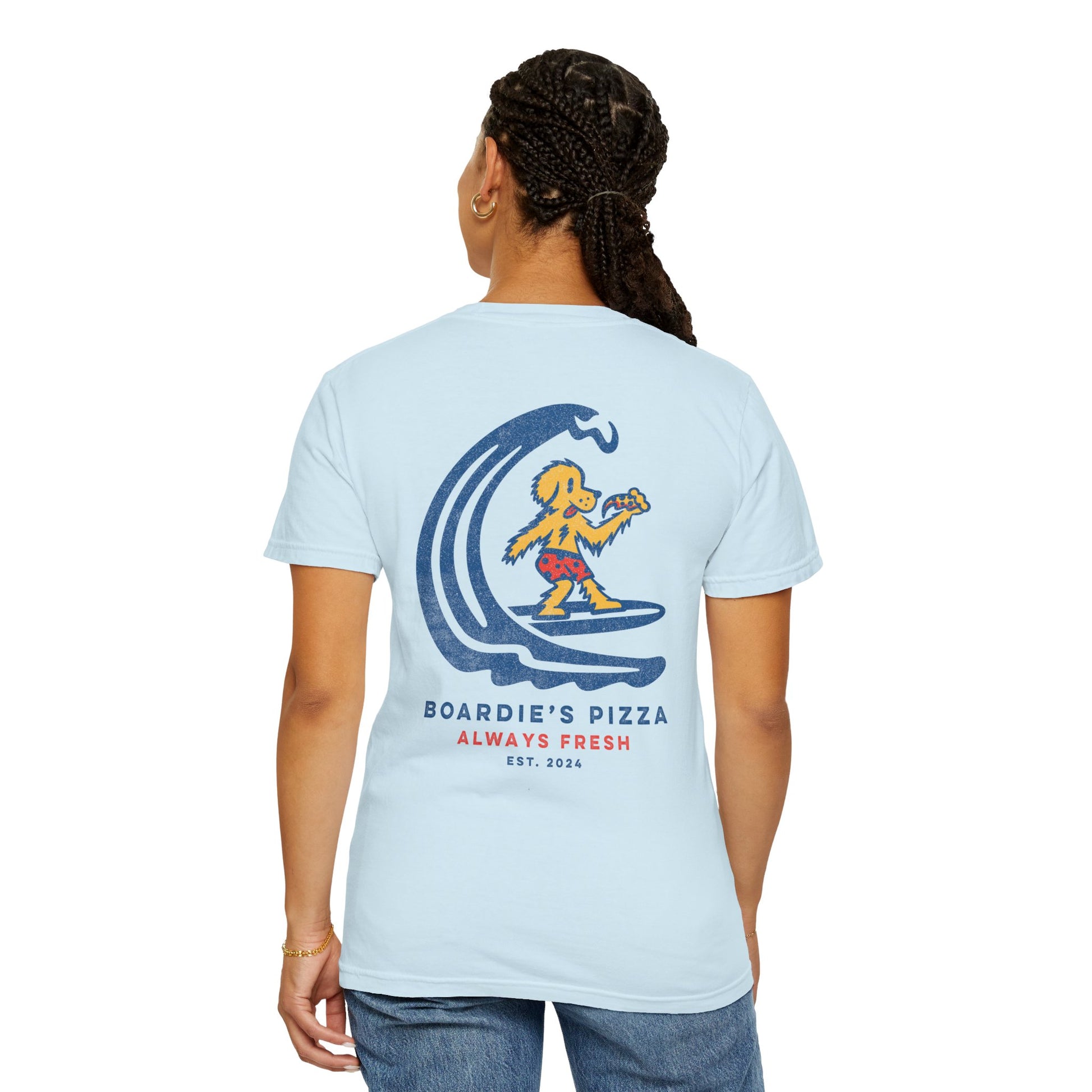 Unisex Boardie's Pizza T-Shirt. This original hand-drawn design is based on a fictional boardwalk pizza shop, with a golden retriever mascot.