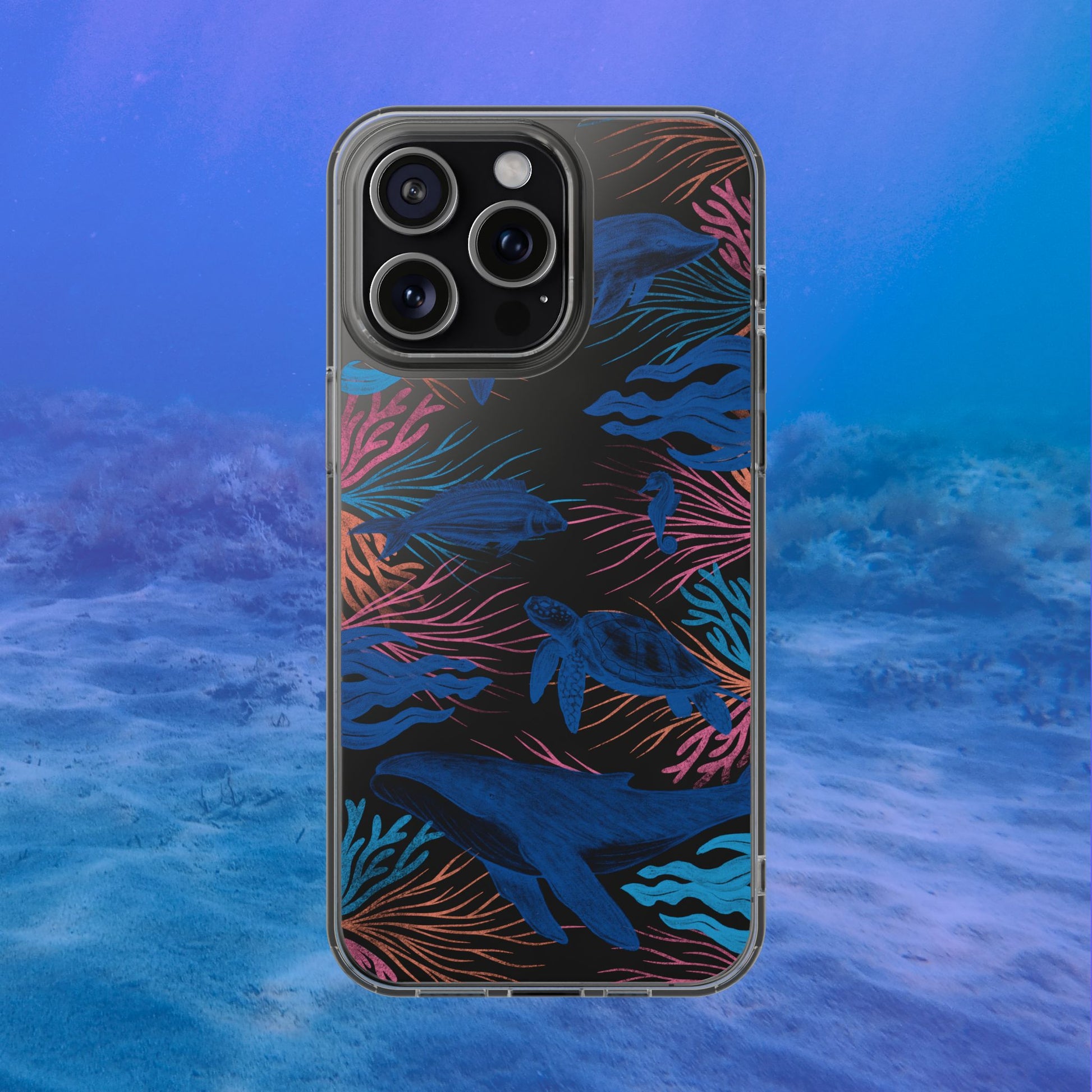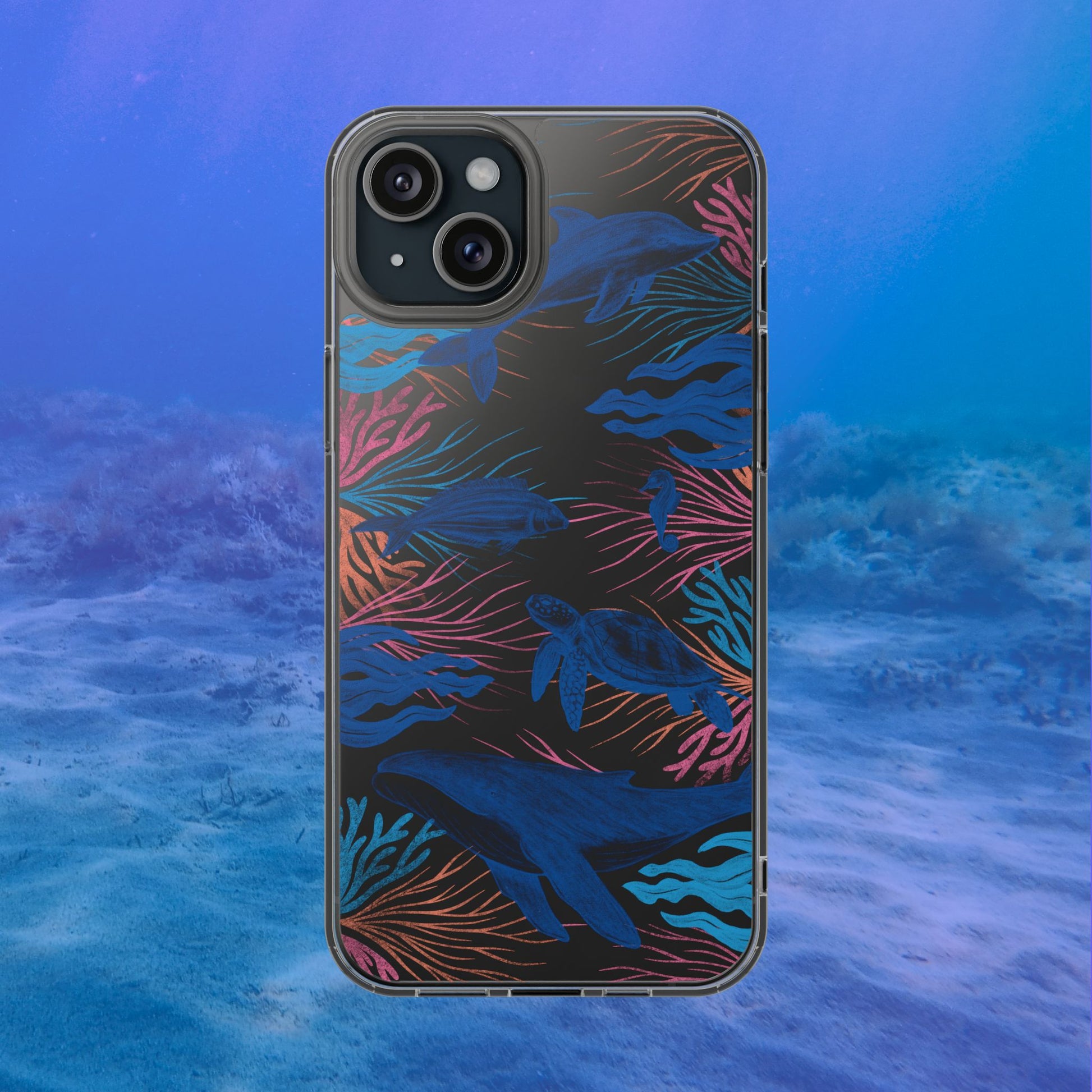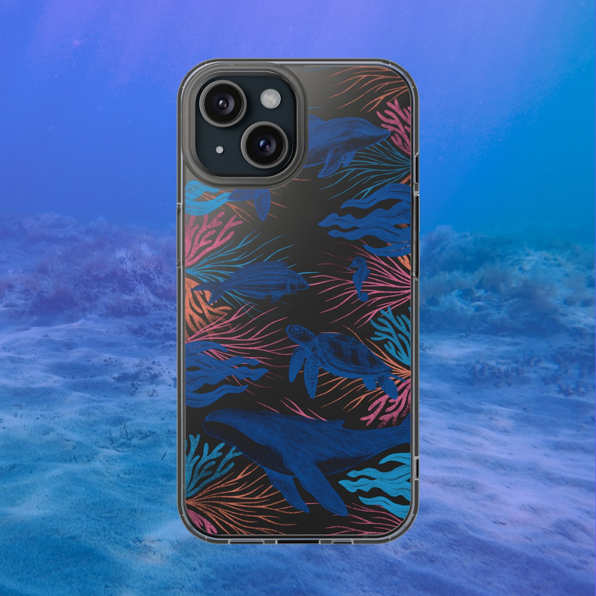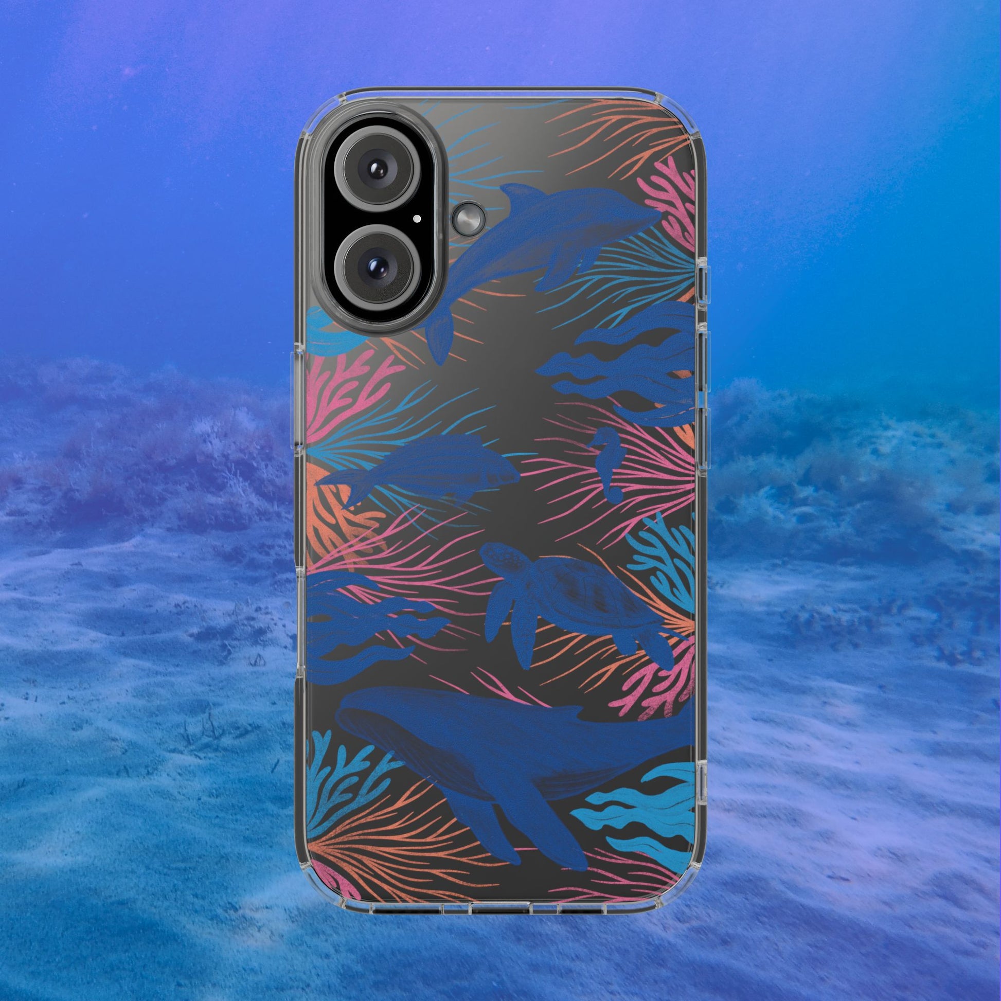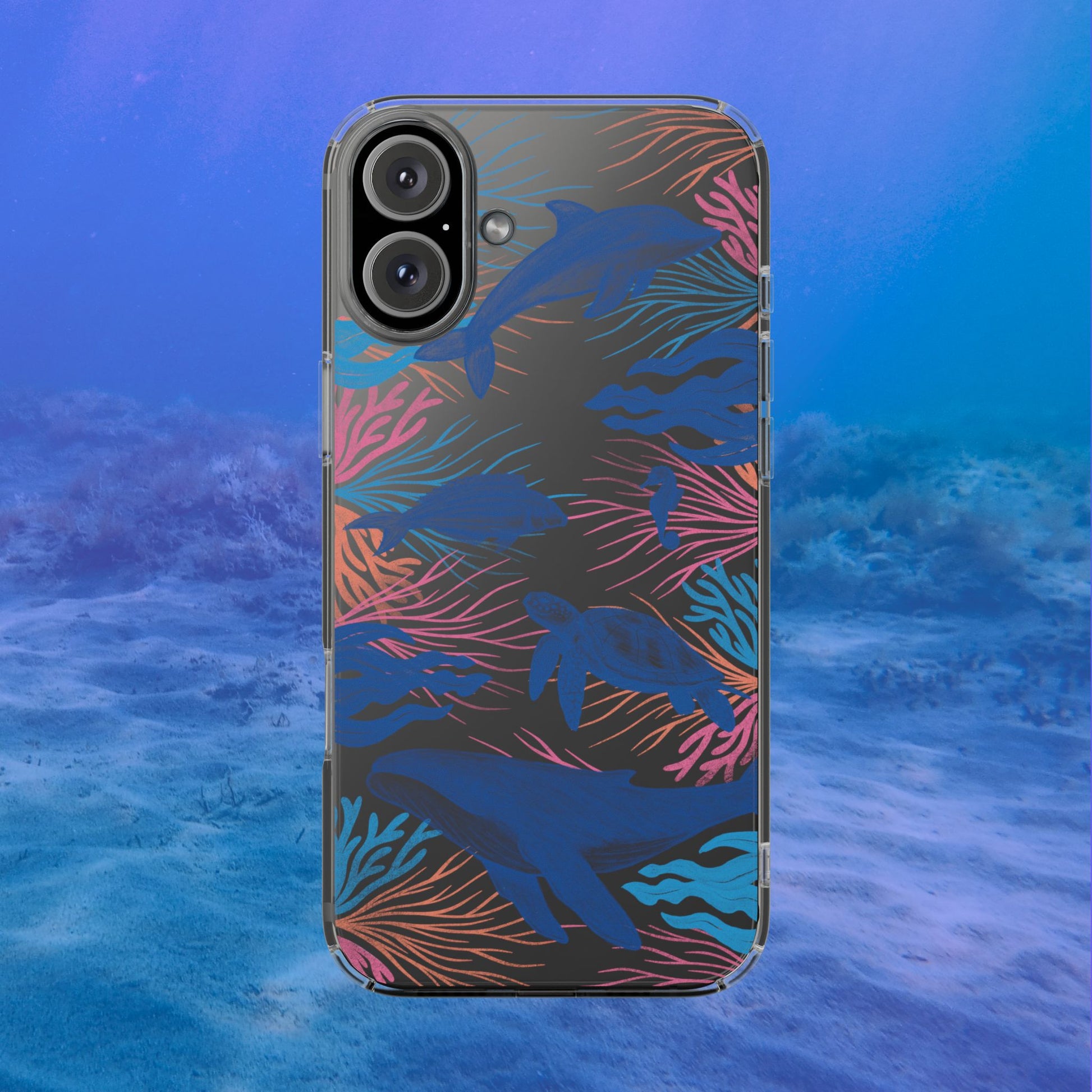 A colorful handrawn coastal phone case by Asho Designs. Featuring a fun palette of pink, orange, and blue, this case features an peaceful ocean scene with a handrawn whale, sea turtle, seahorse, dolphin, fish, and seaweed.