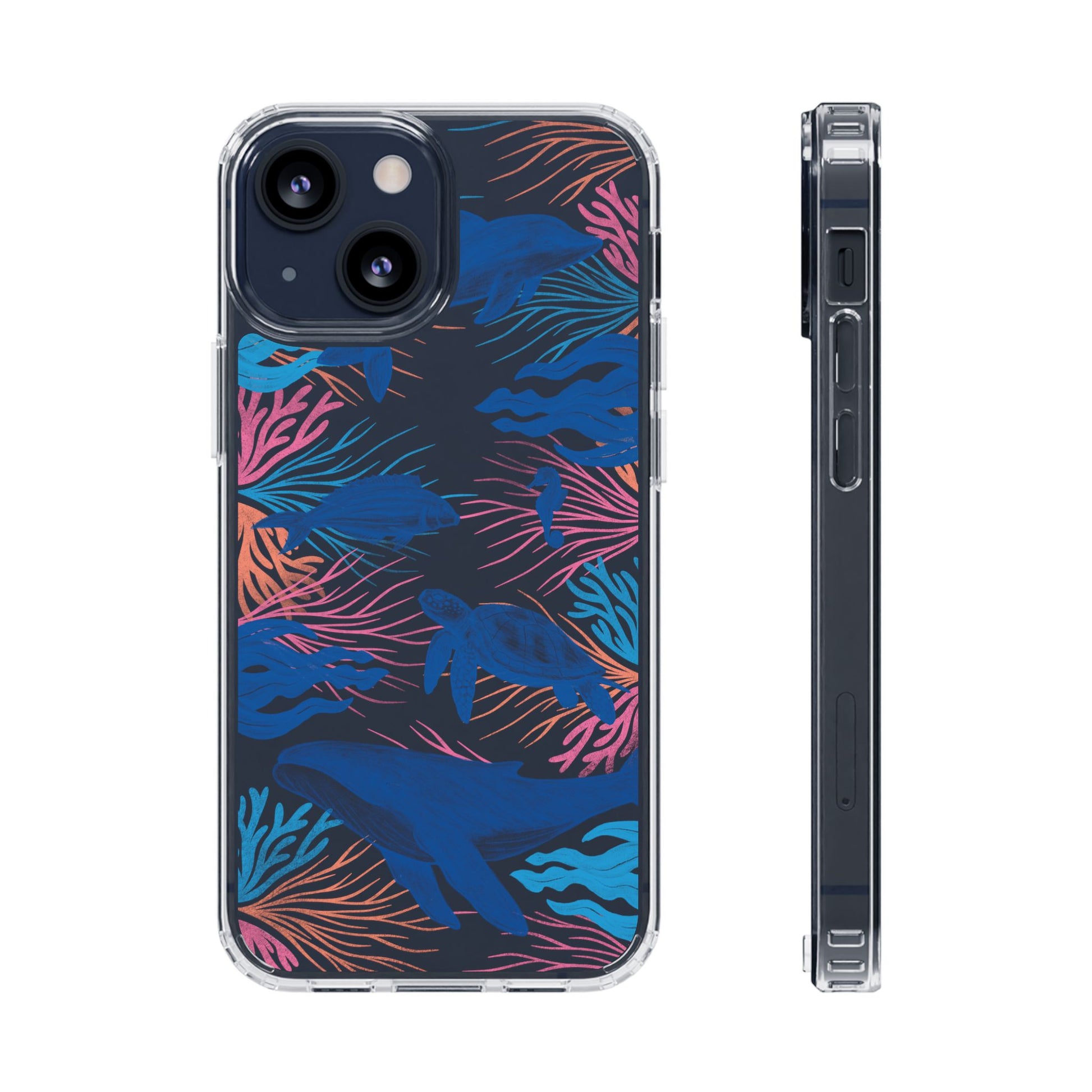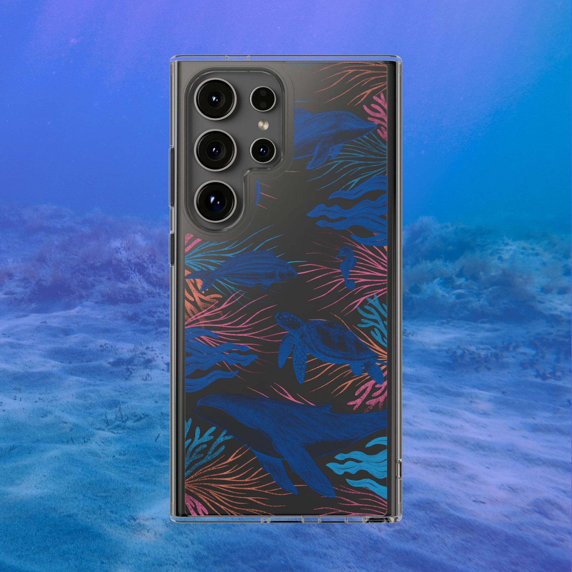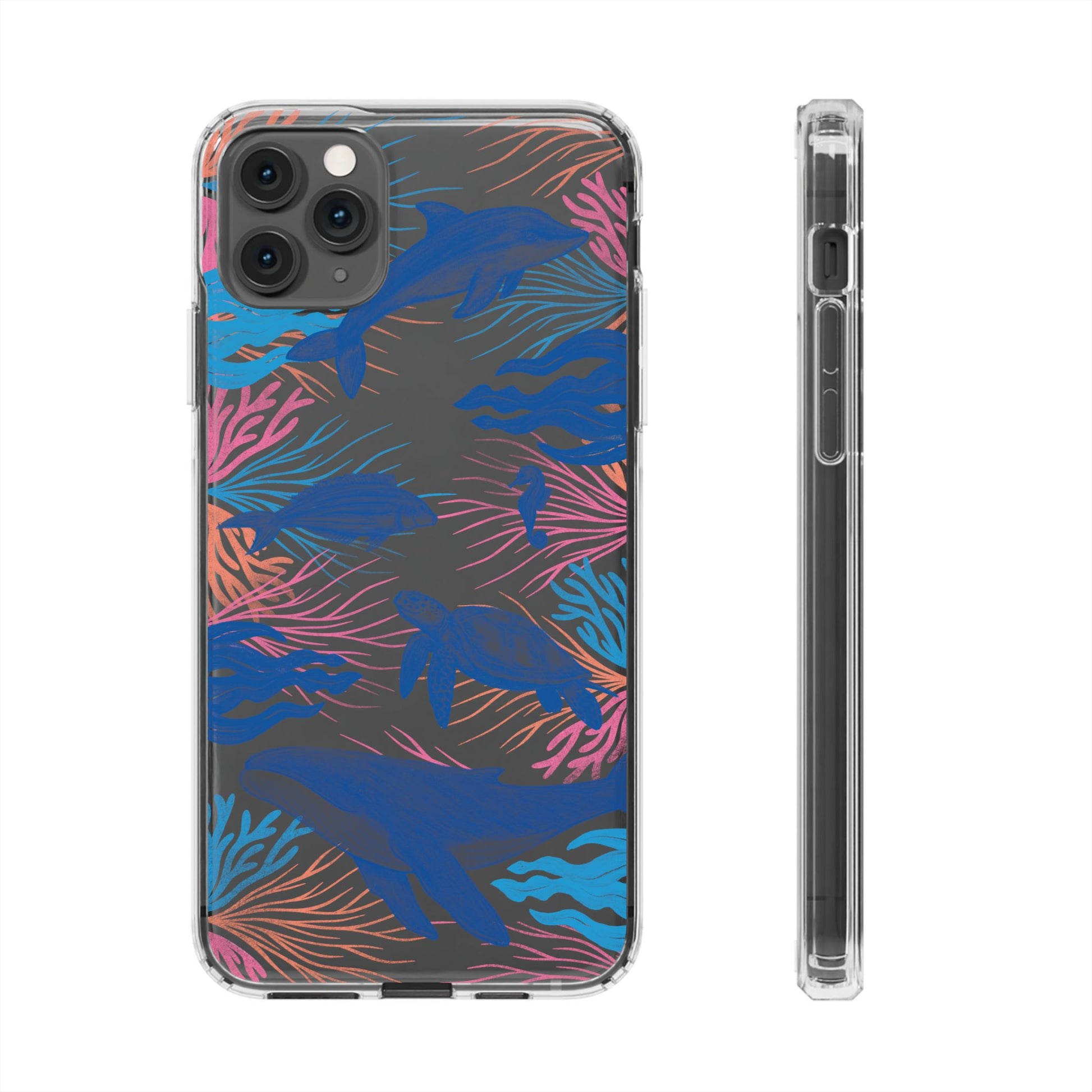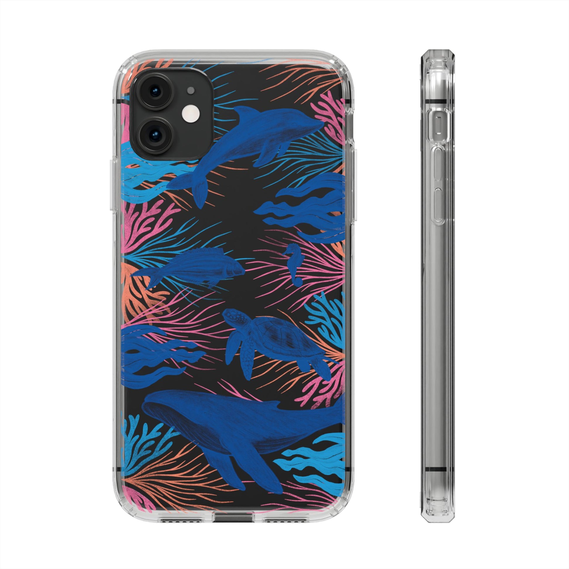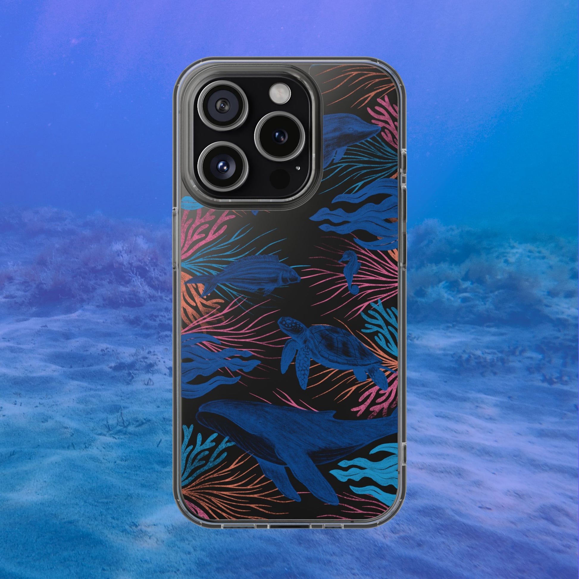 A colorful handrawn coastal phone case by Asho Designs. Featuring a fun palette of pink, orange, and blue, this case features an peaceful ocean scene with a handrawn whale, sea turtle, seahorse, dolphin, fish, and seaweed.