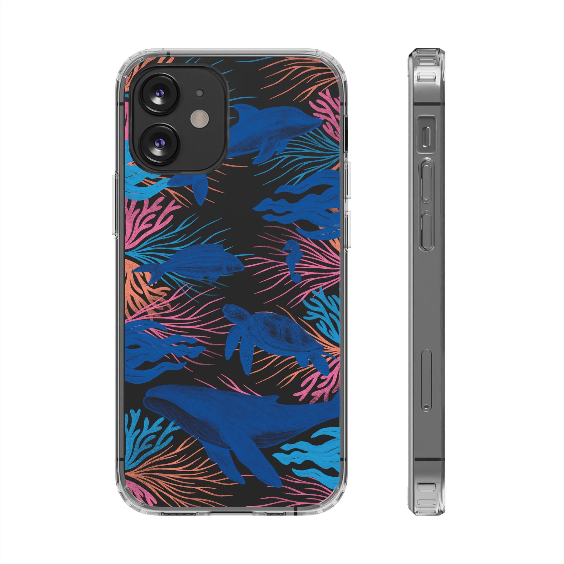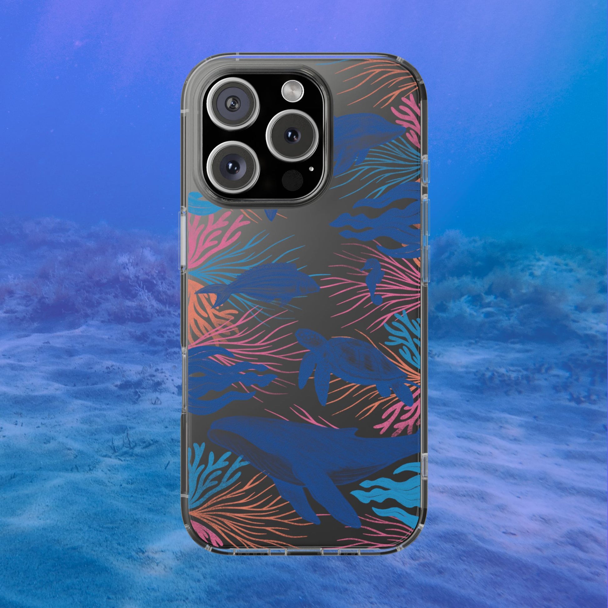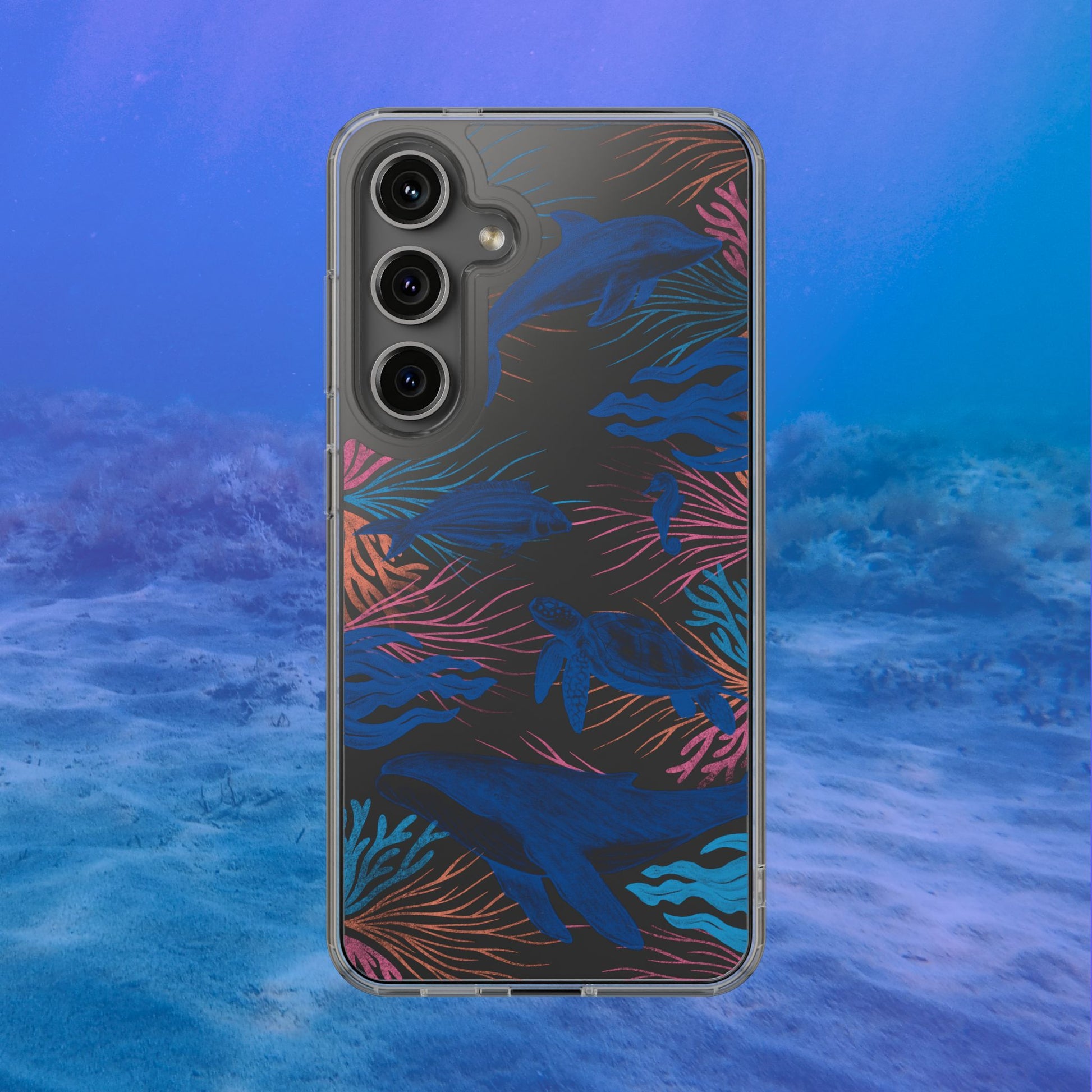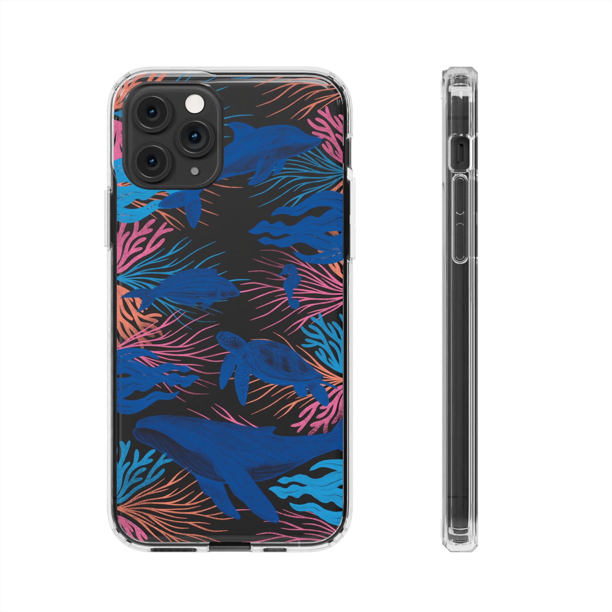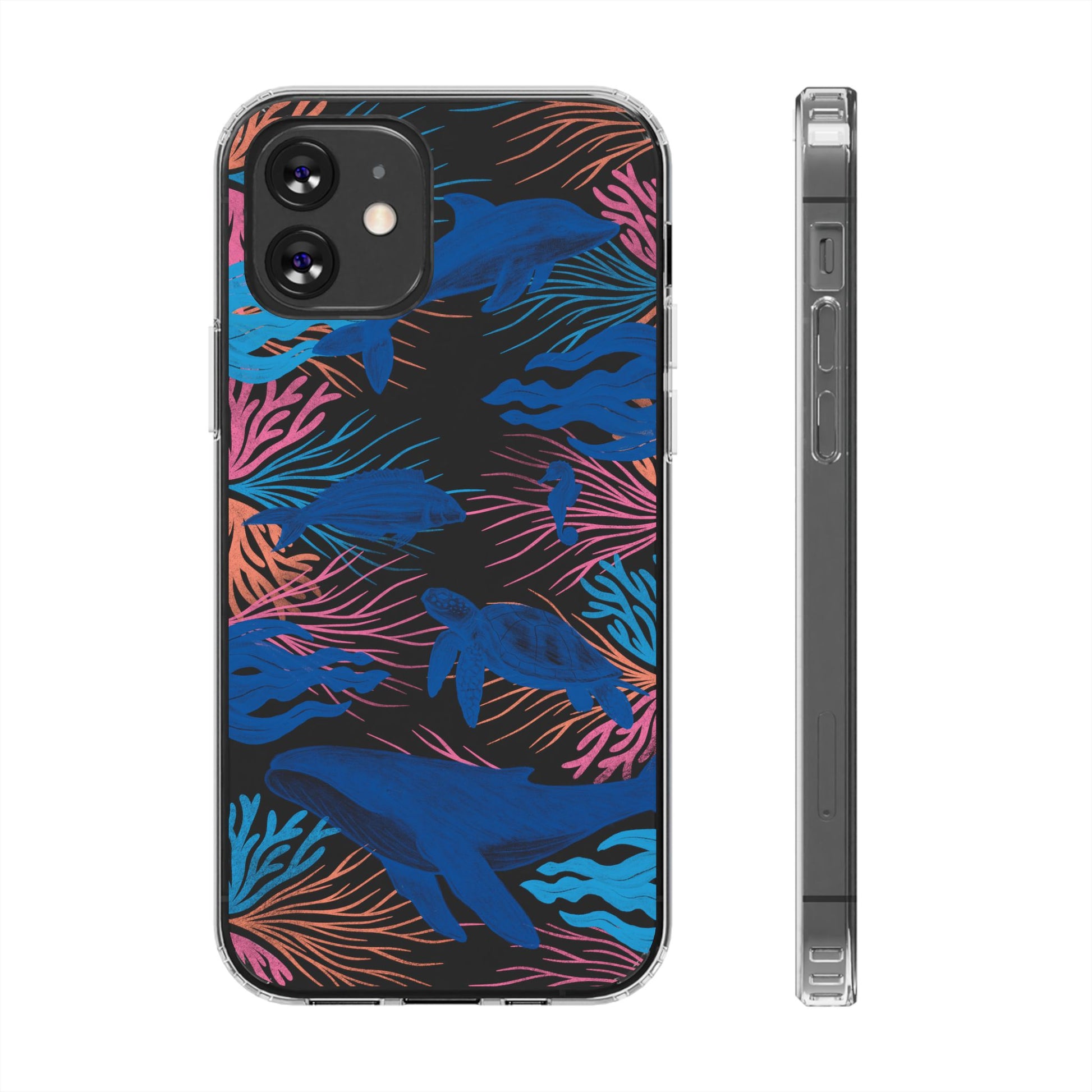 A colorful handrawn coastal phone case by Asho Designs. Featuring a fun palette of pink, orange, and blue, this case features an peaceful ocean scene with a handrawn whale, sea turtle, seahorse, dolphin, fish, and seaweed.