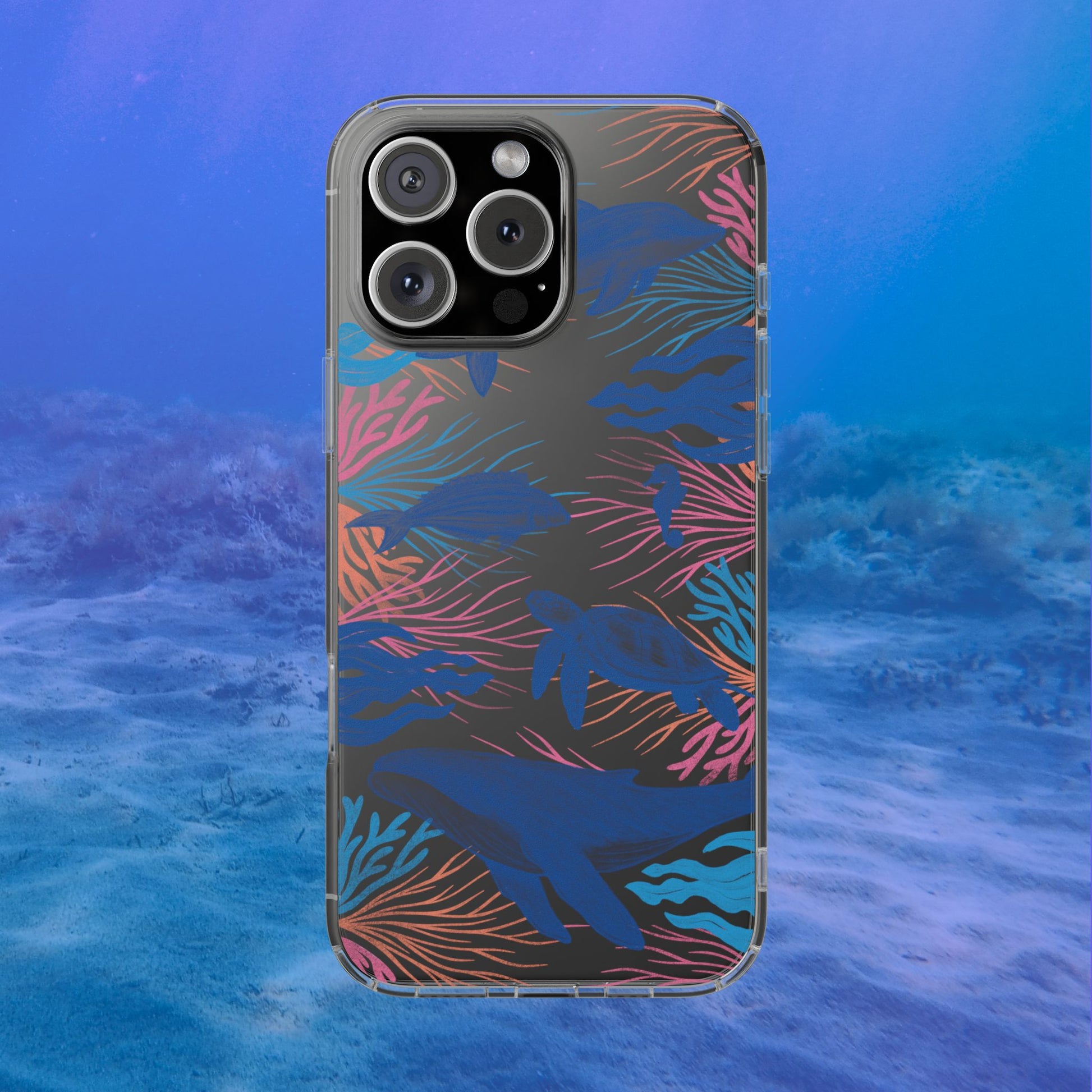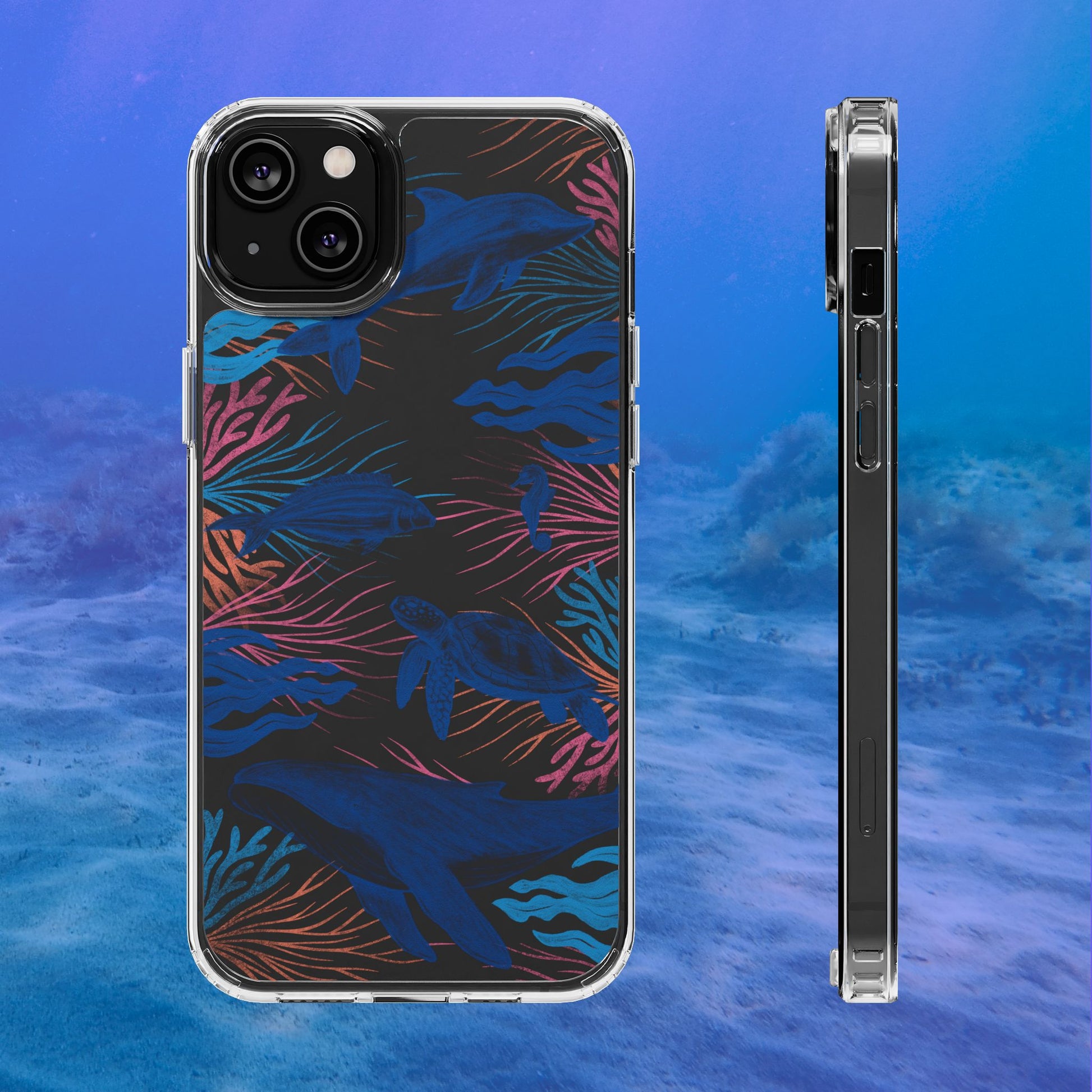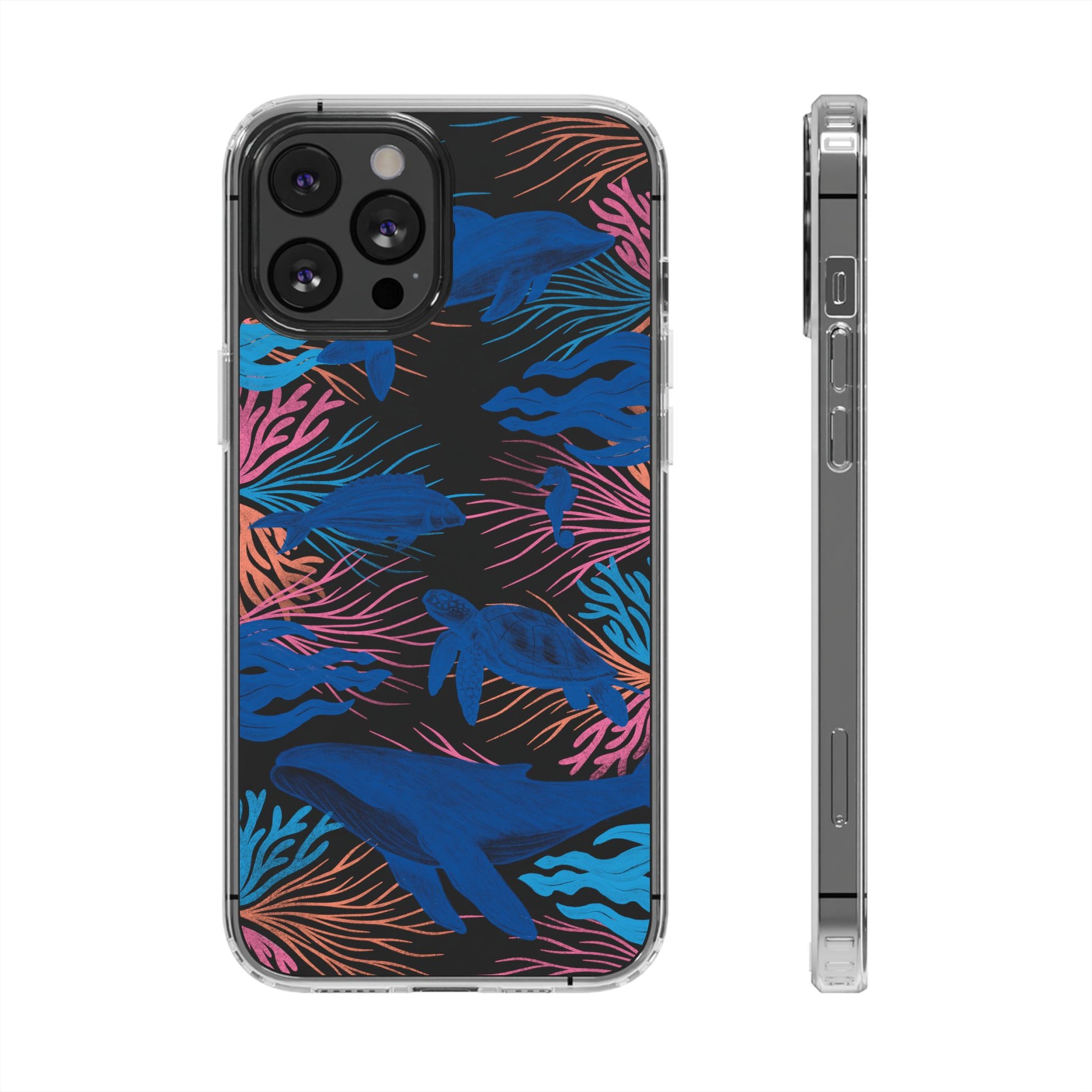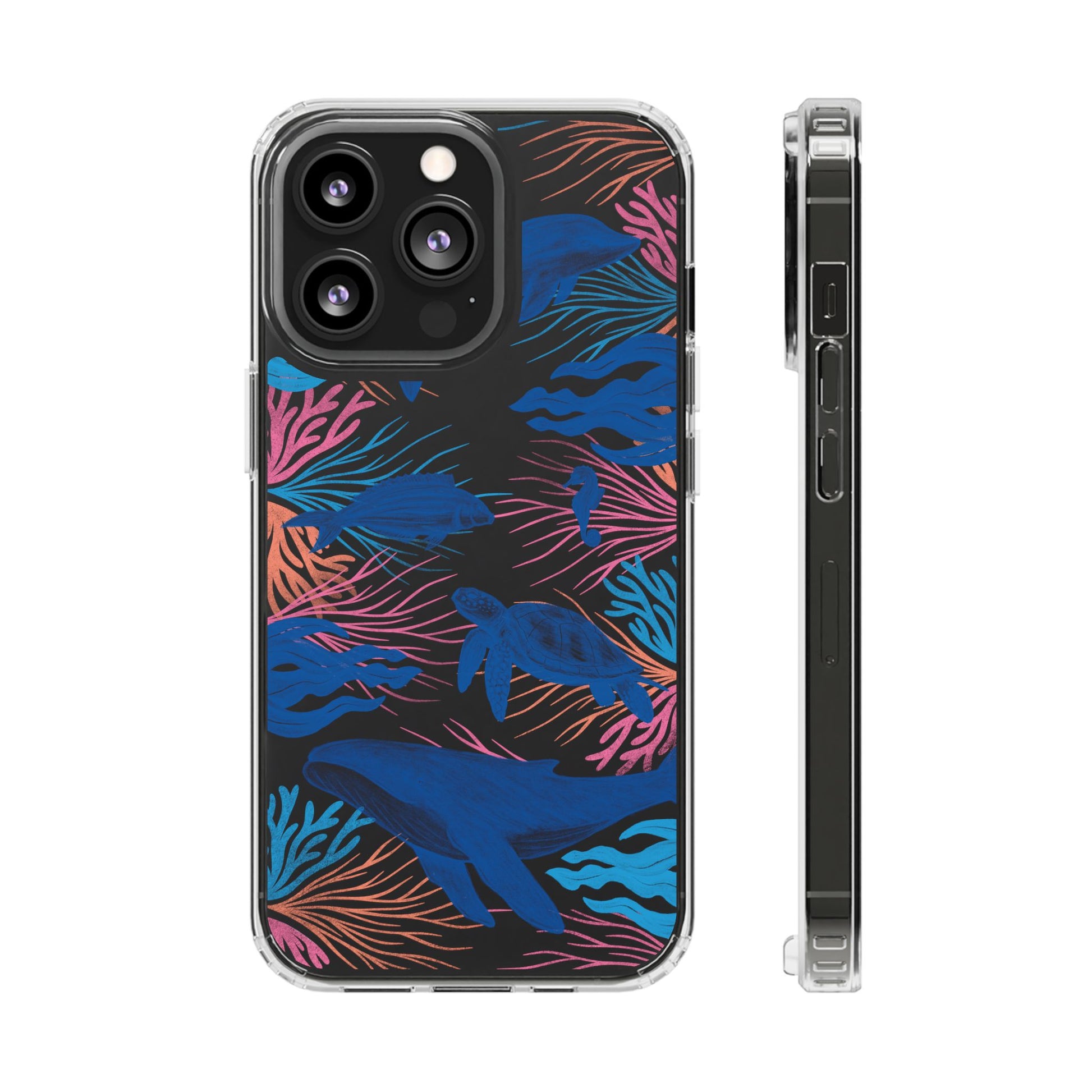 A colorful handrawn coastal phone case by Asho Designs. Featuring a fun palette of pink, orange, and blue, this case features an peaceful ocean scene with a handrawn whale, sea turtle, seahorse, dolphin, fish, and seaweed.