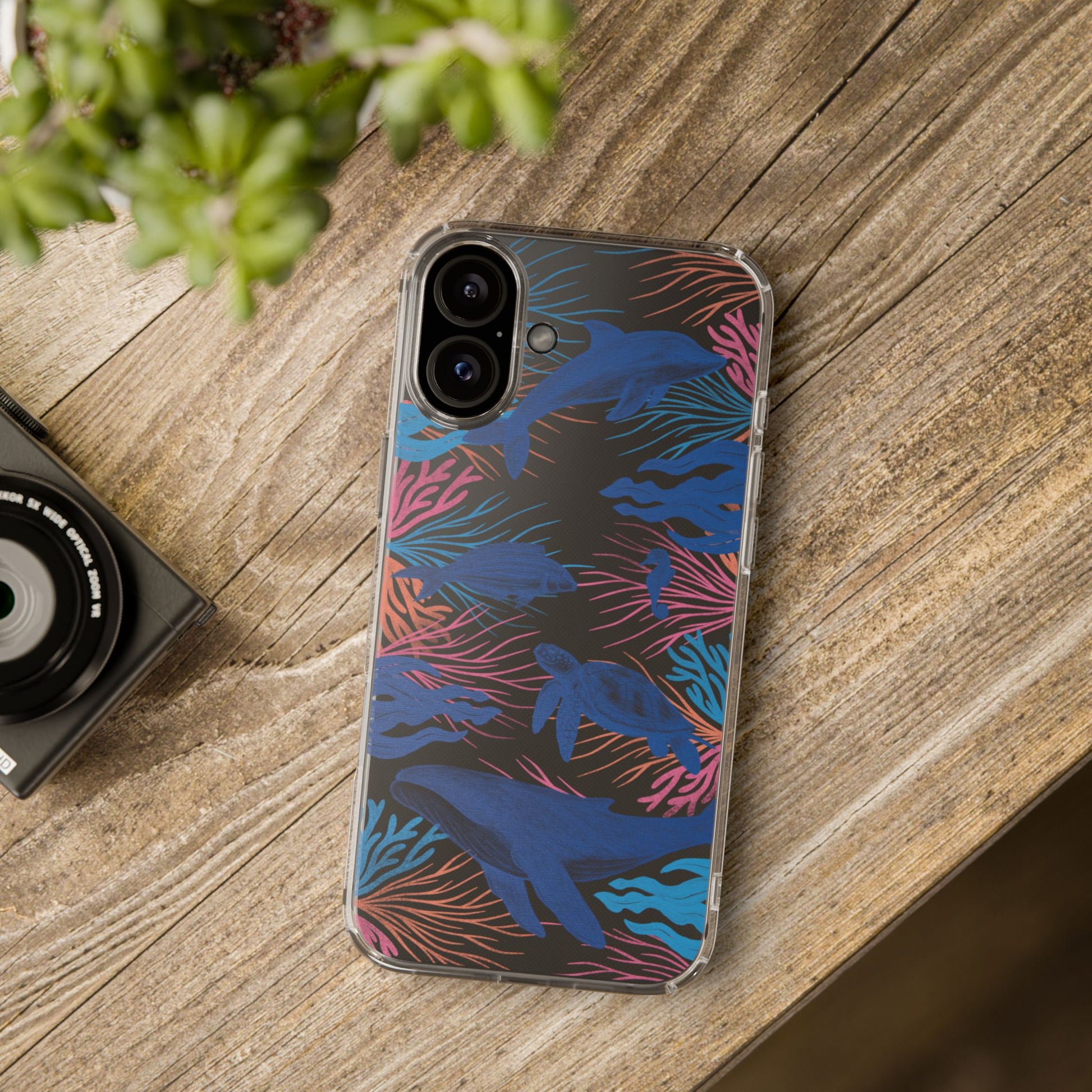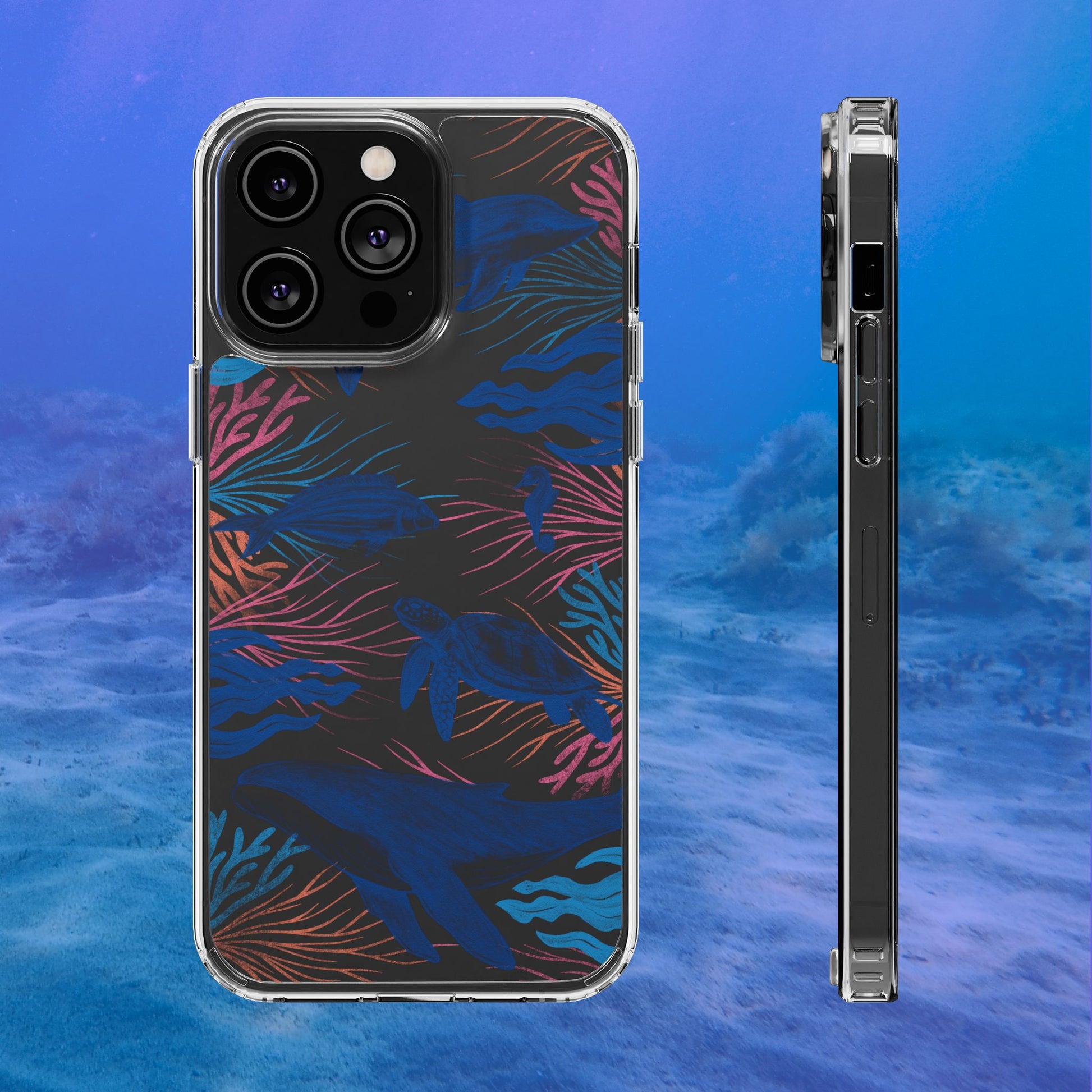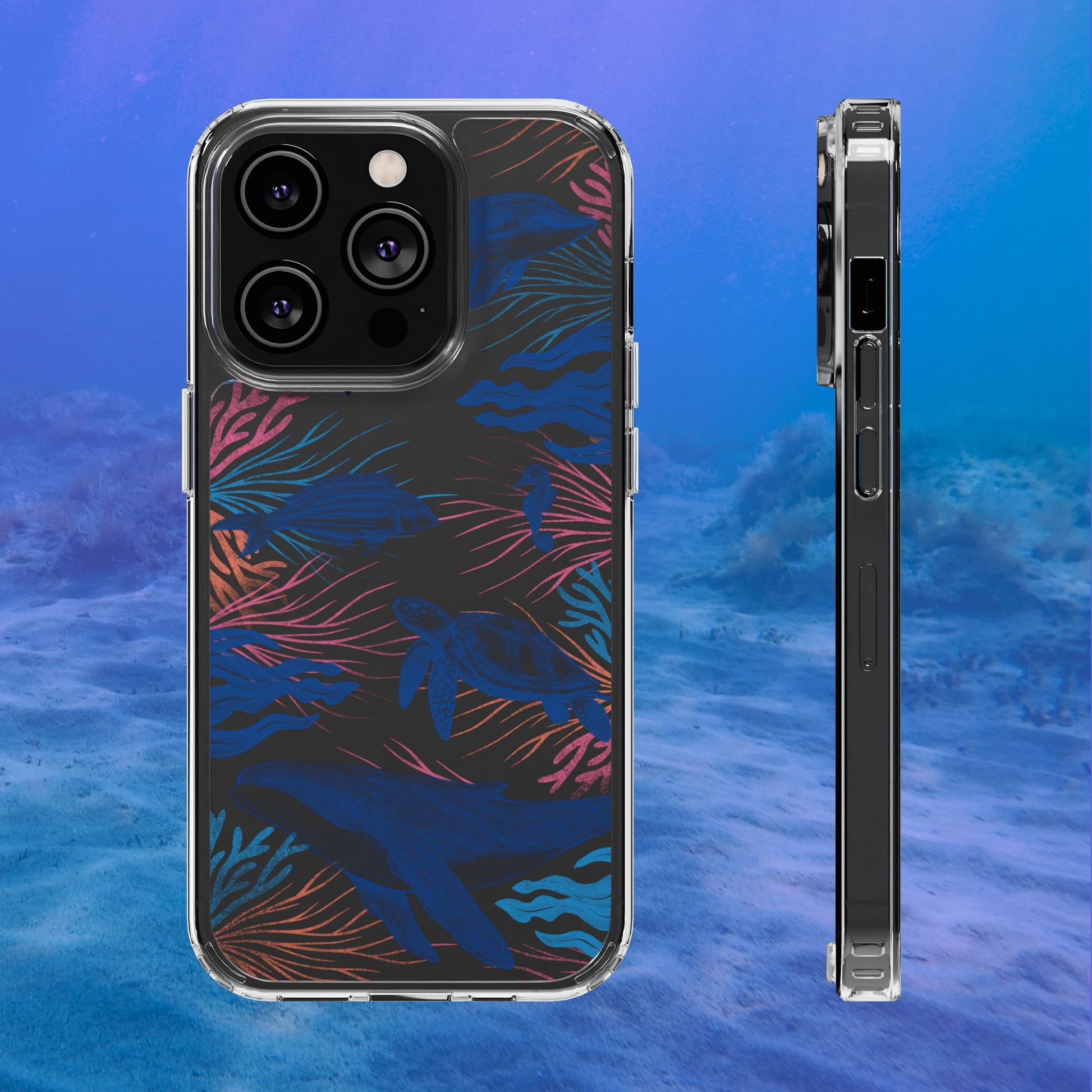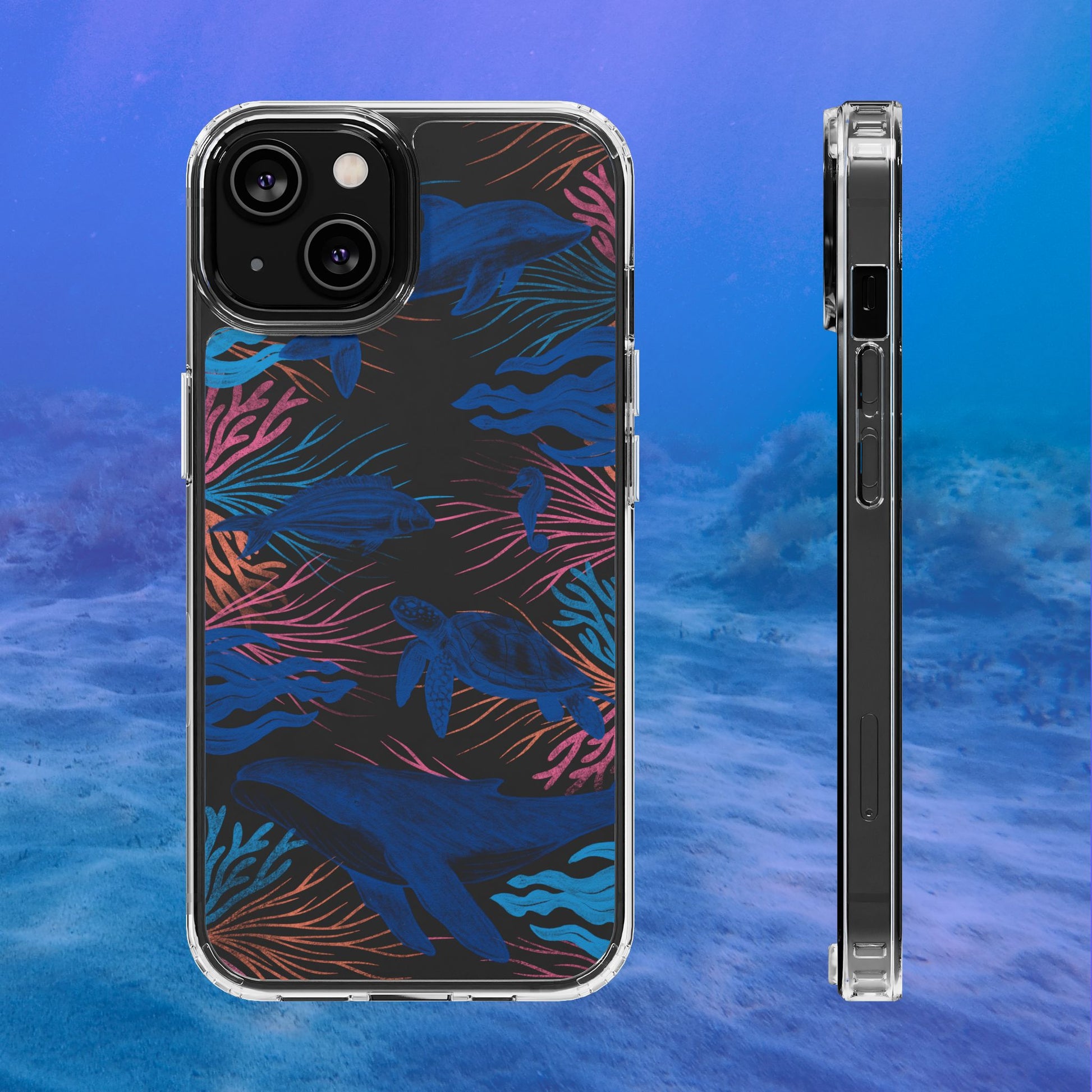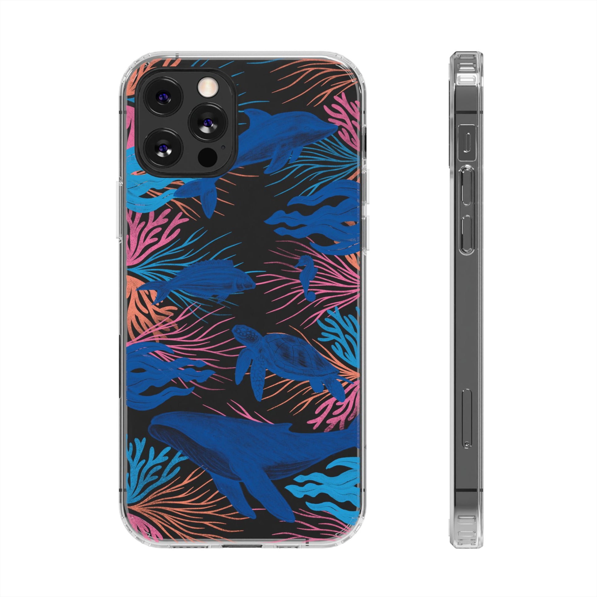 A colorful handrawn coastal phone case by Asho Designs. Featuring a fun palette of pink, orange, and blue, this case features an peaceful ocean scene with a handrawn whale, sea turtle, seahorse, dolphin, fish, and seaweed.