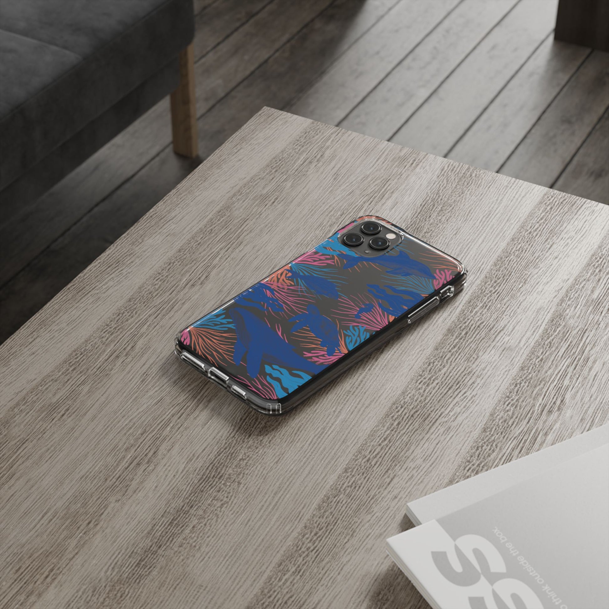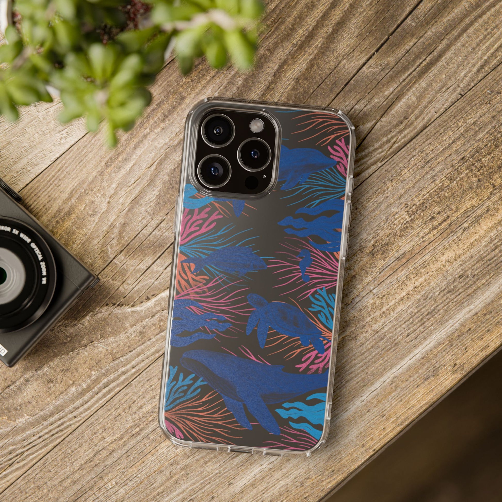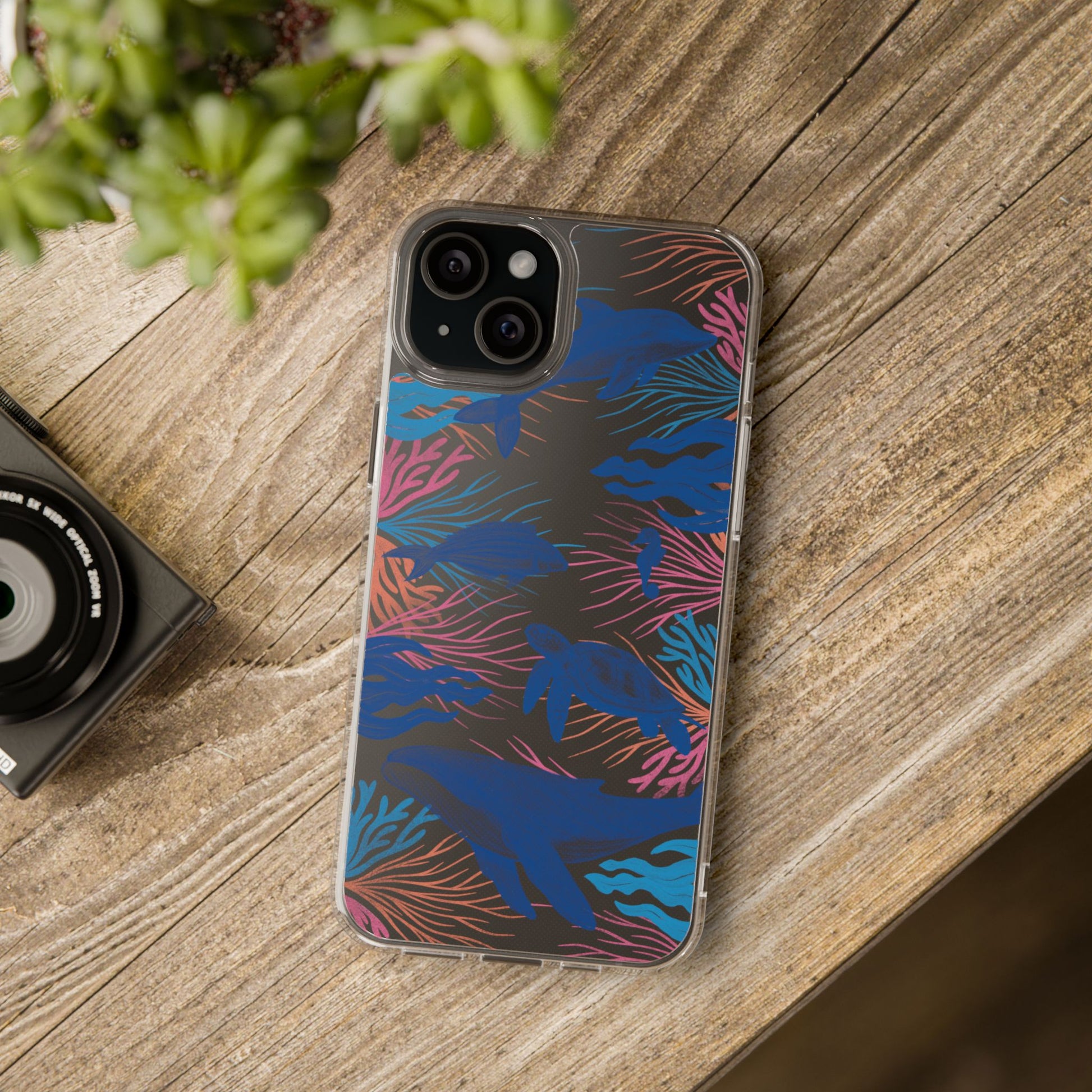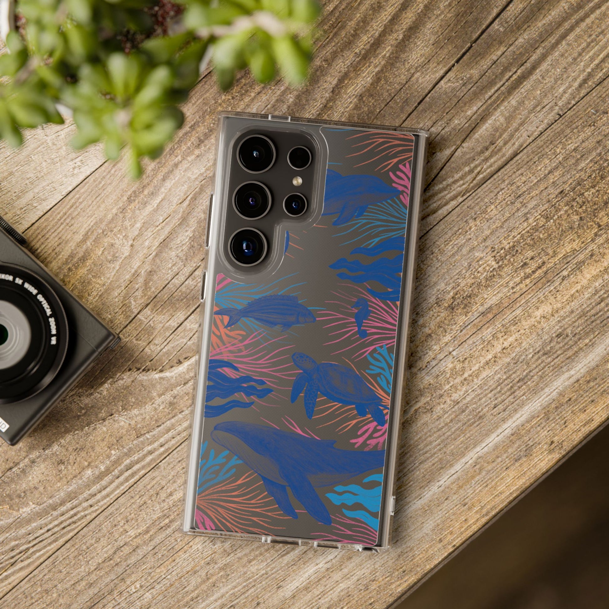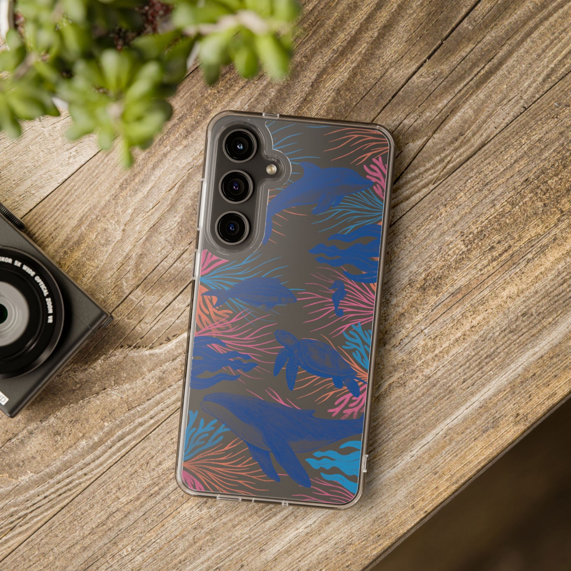 A colorful handrawn coastal phone case by Asho Designs. Featuring a fun palette of pink, orange, and blue, this case features an peaceful ocean scene with a handrawn whale, sea turtle, seahorse, dolphin, fish, and seaweed.