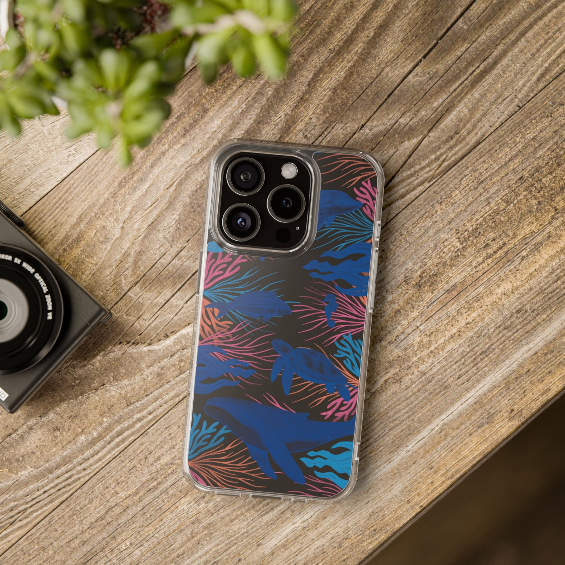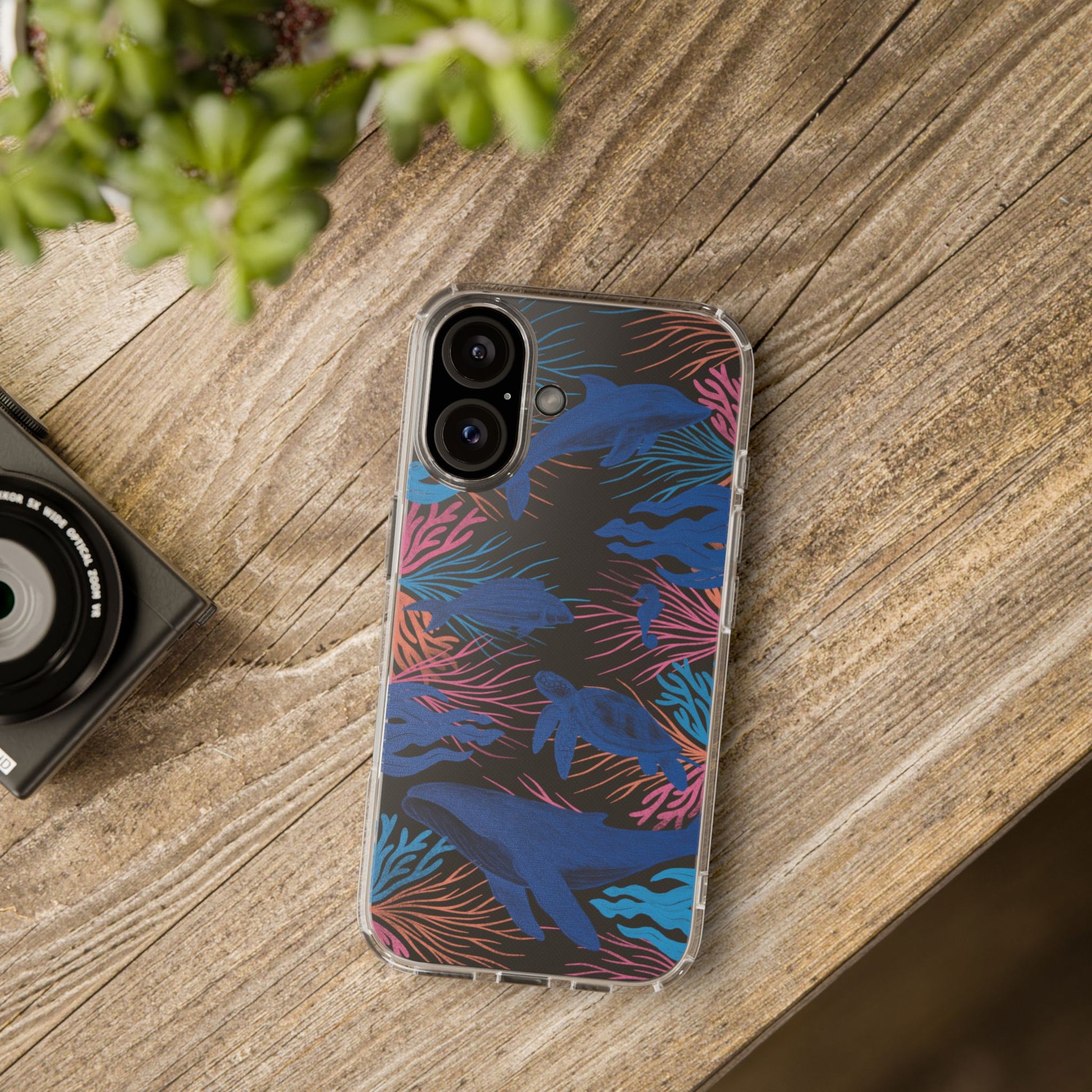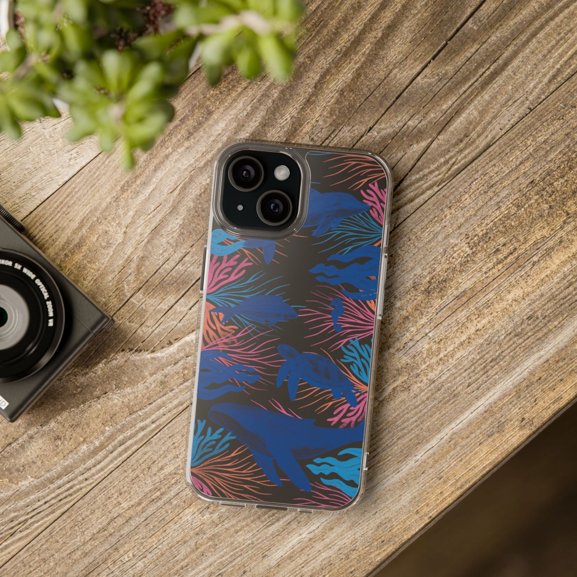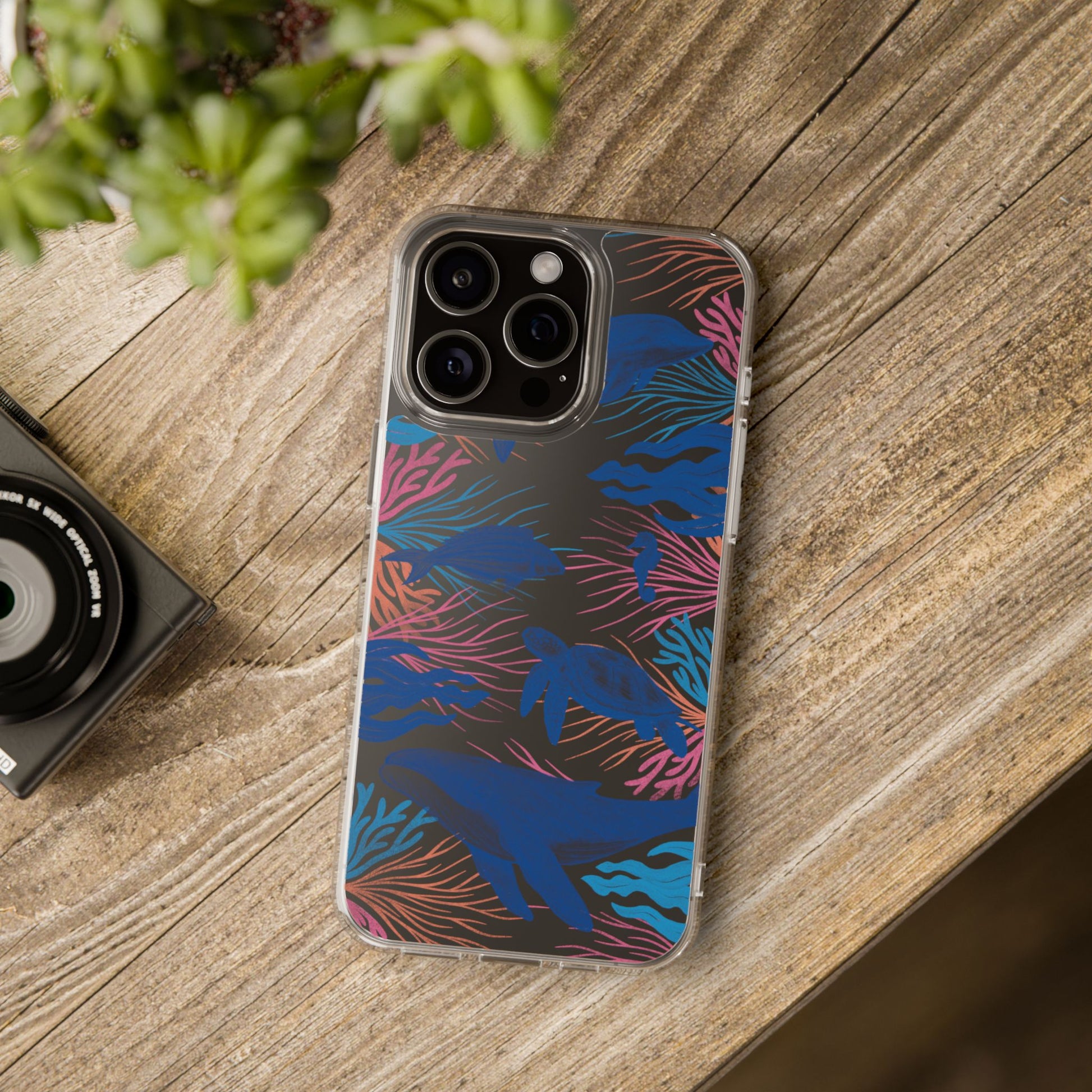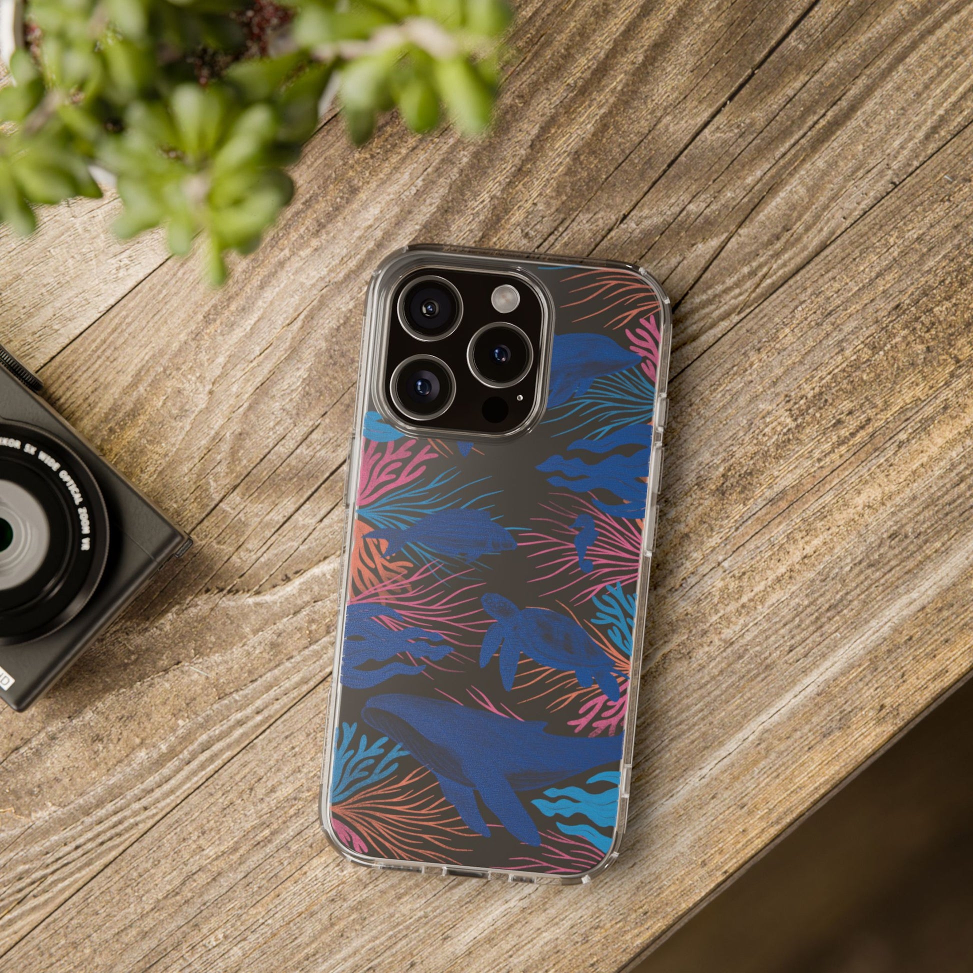 A colorful handrawn coastal phone case by Asho Designs. Featuring a fun palette of pink, orange, and blue, this case features an peaceful ocean scene with a handrawn whale, sea turtle, seahorse, dolphin, fish, and seaweed.