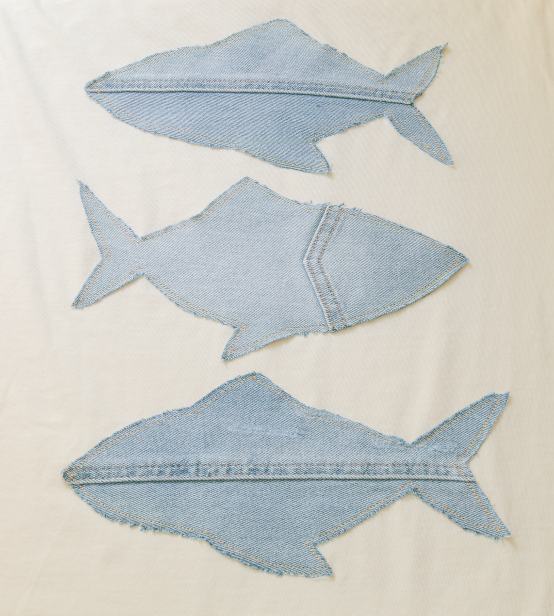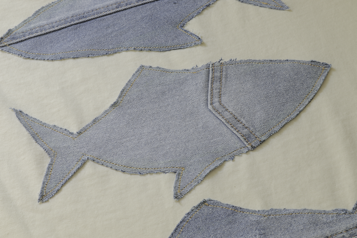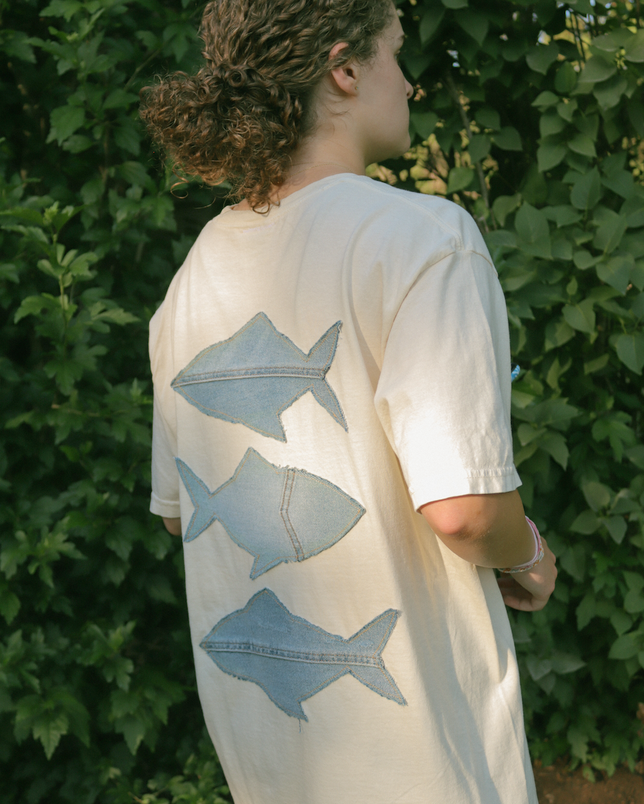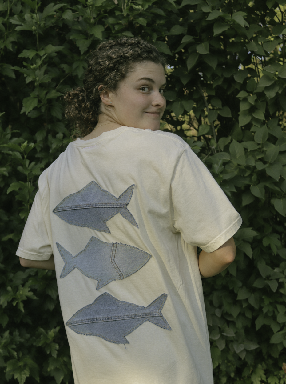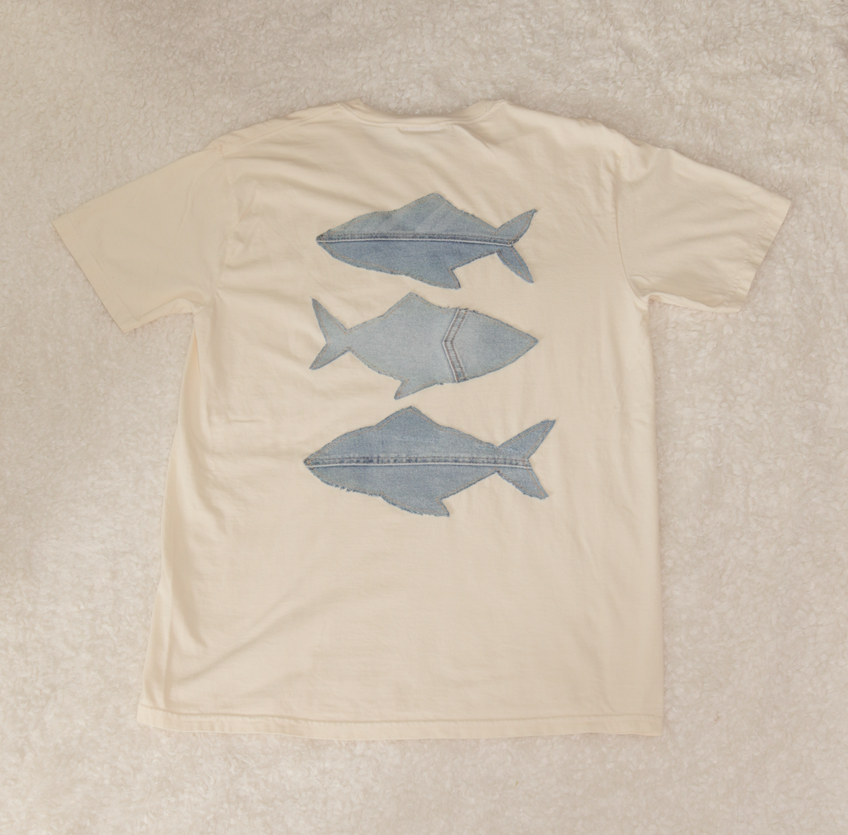 One-of-a-kind pieces! Each Denim Fish T-Shirt is unique, with character and comfort! Each fish patch is made from recycled denim, then assembled and sewn onto the t-shirt by hand. This tee has a lot of personality in subtle way! Wear it to the beach, to grab ice cream, or for a bike ride!