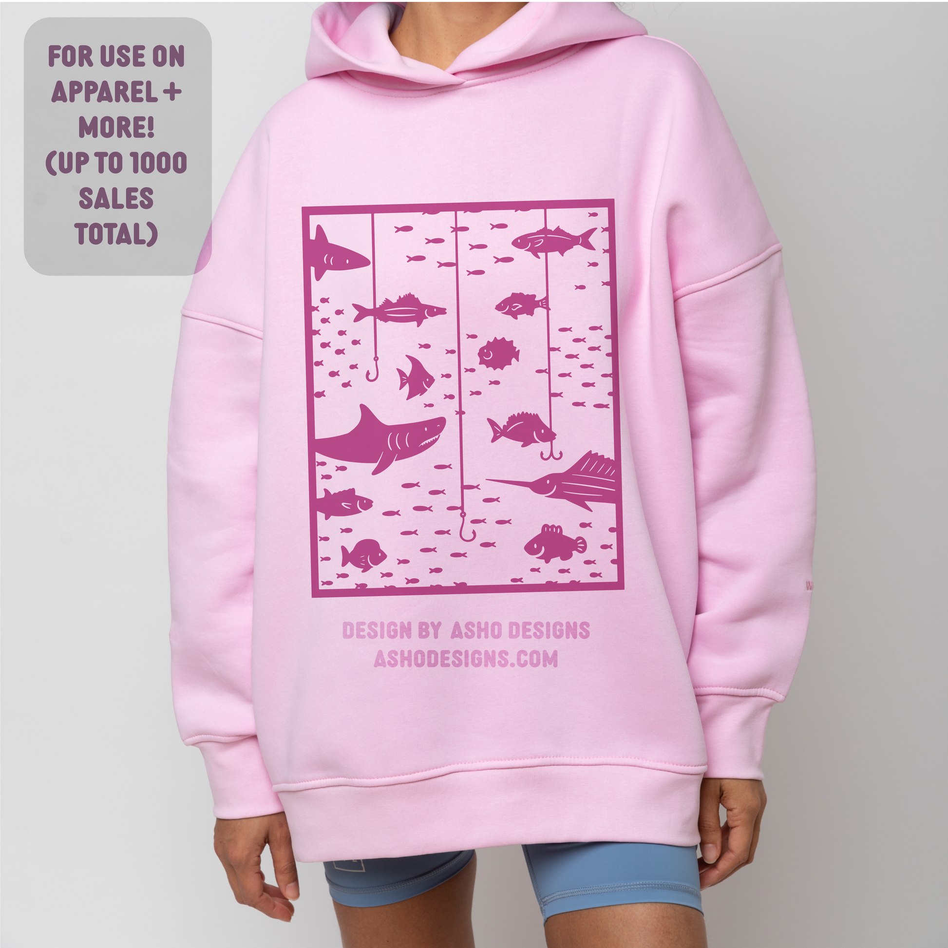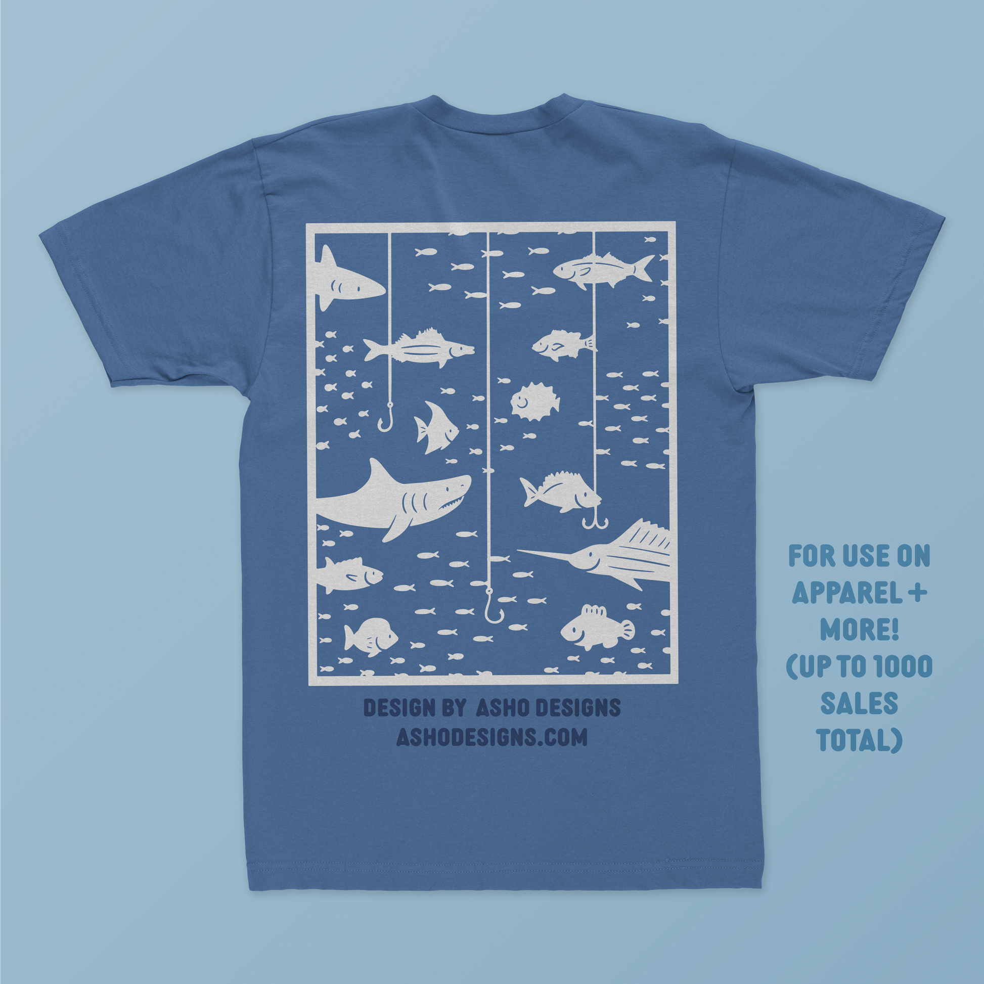 Fish and Sharks design for personal and commercial use (up to 1000 sales). Create products with ease with a design customers will love! This design would look great on a t-shirt, hoodie, tote bag, etc. The possibilities are endless!
