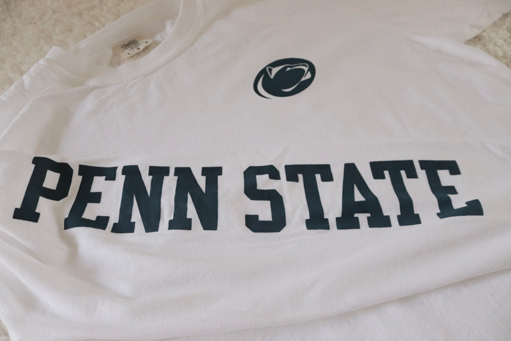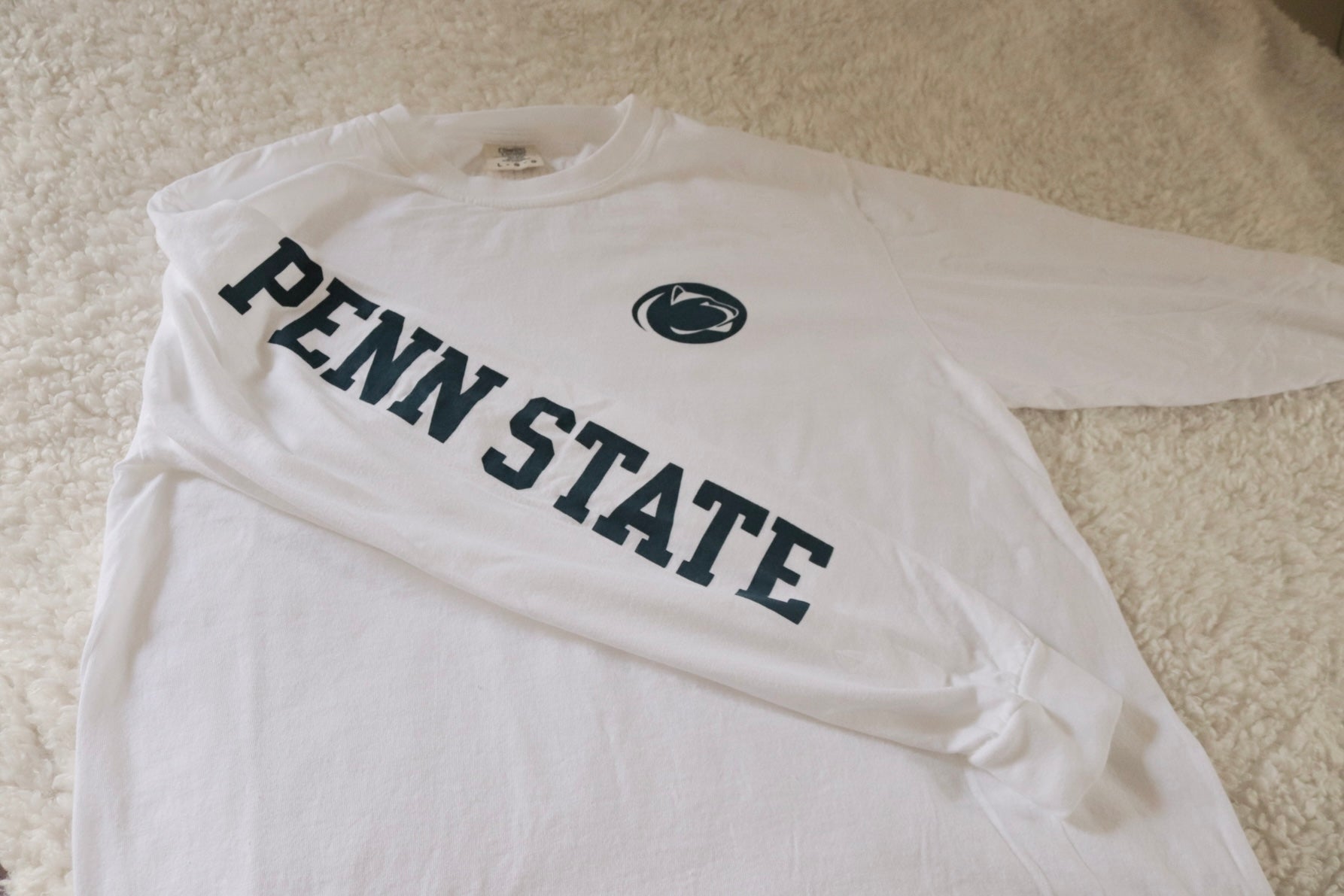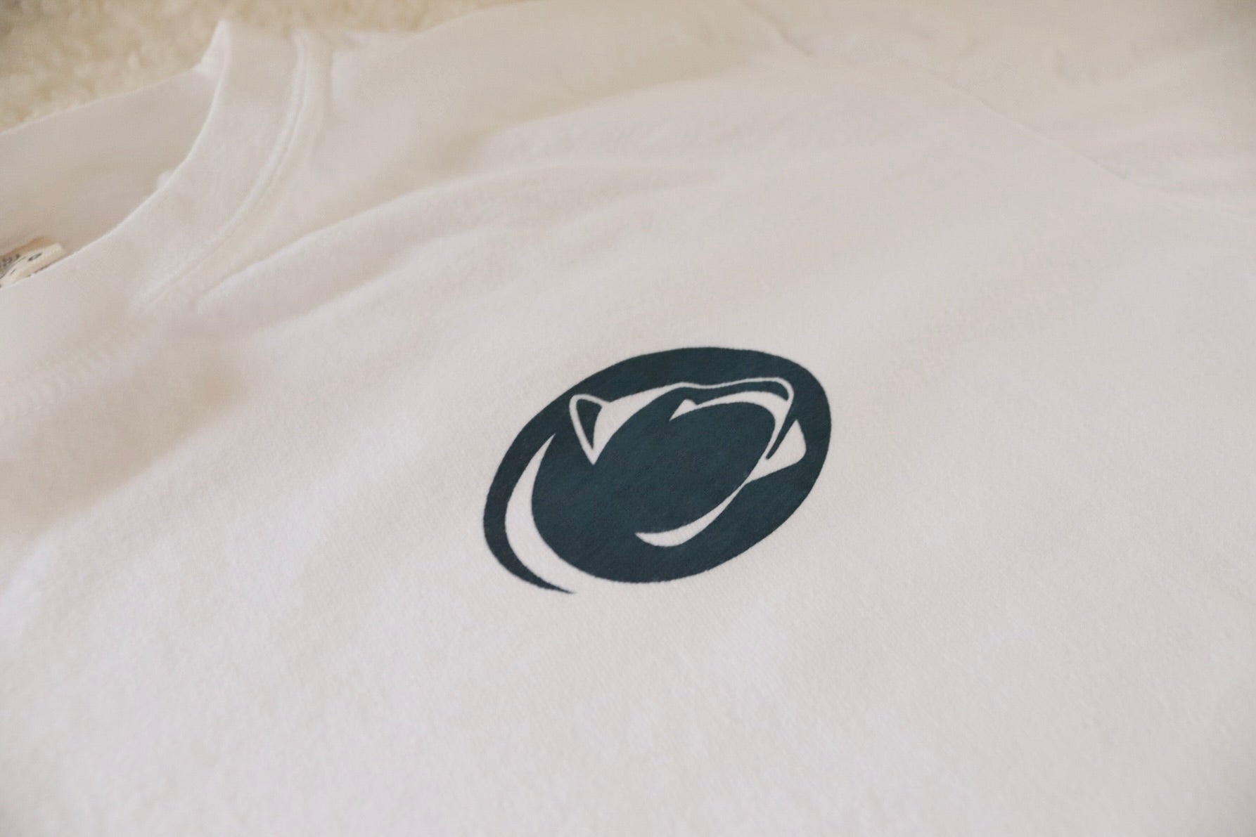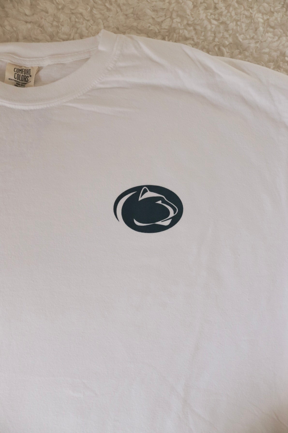 As unique Penn State created by Asho Designs. As a student at Penn State, why not design and screen-print custom merch? This shirt features "Penn State" in big letters down the right sleeve, and the classic Nittany Lion logo on the front left chest.