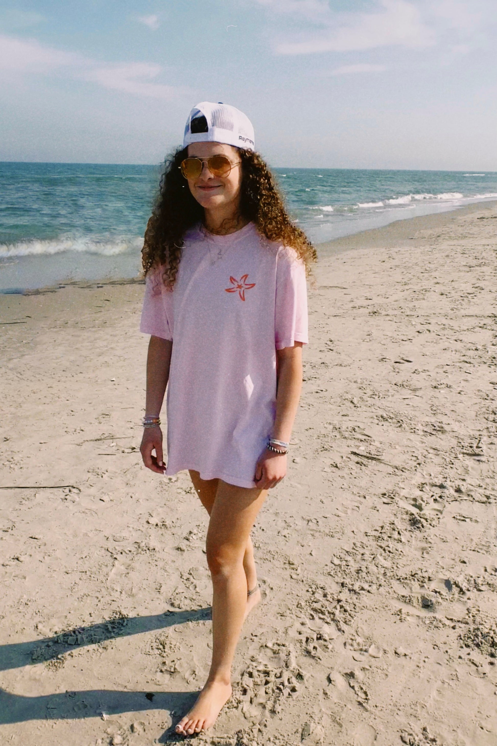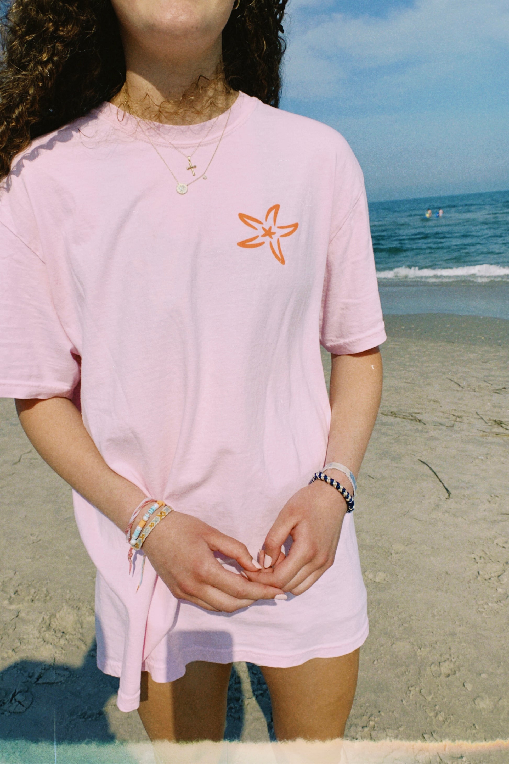 Add a fun pop of color to your wardrobe with the Pink Sea Tee! This tee is soft to the touch, and features a fun design with beach-related doodles. Wear it on a trip to the beach, a bike ride, or to grab ice cream! The perfect summer tshirts!