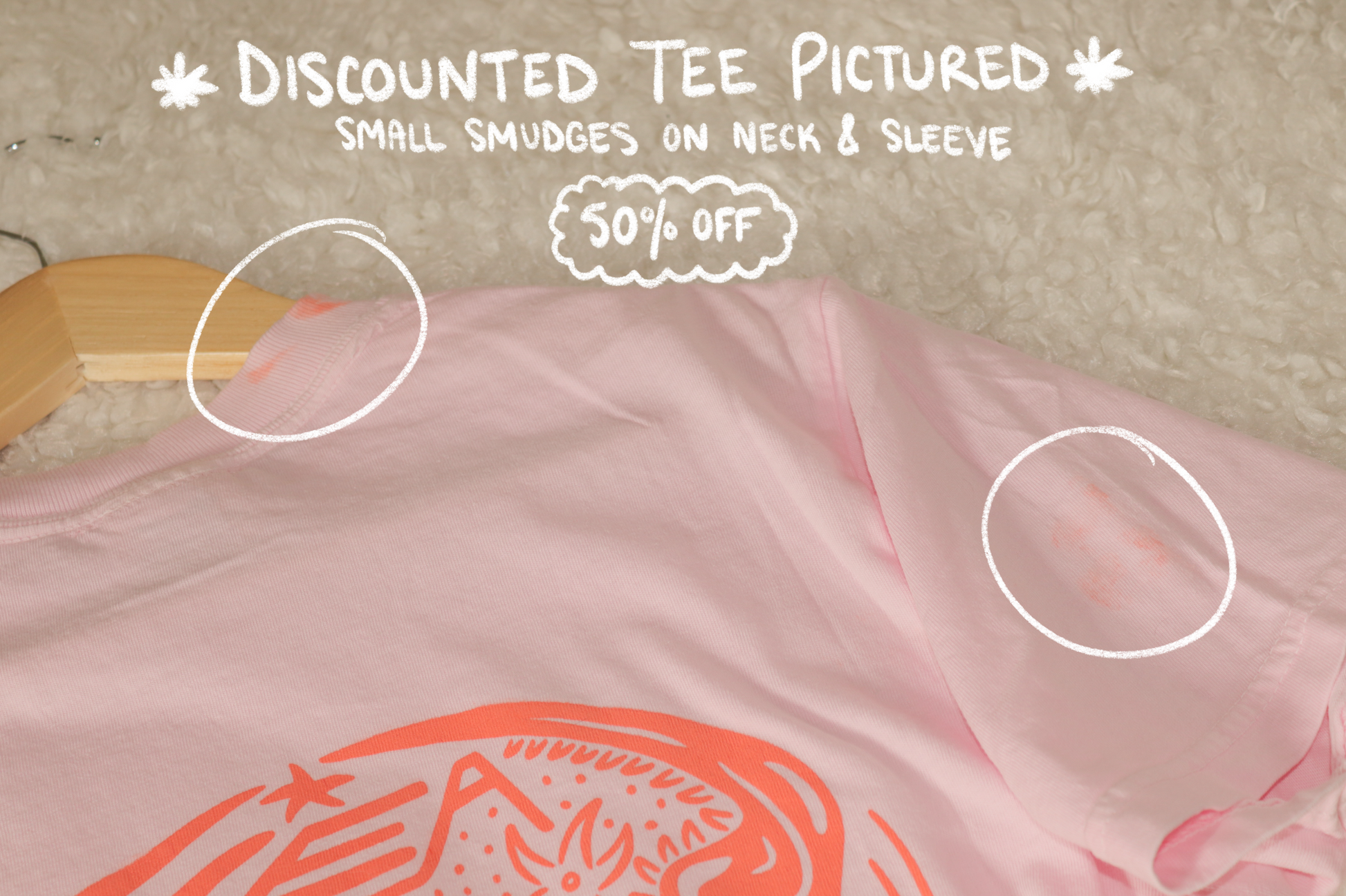 **Additional info for the discounted misprint tee (size small): The "defective" tee has a small amount of ink on the back at neck area as well as the right sleeve of the tee due to a printing error. For this reason, it is discounted at 50% off. See last picture for a visual.
