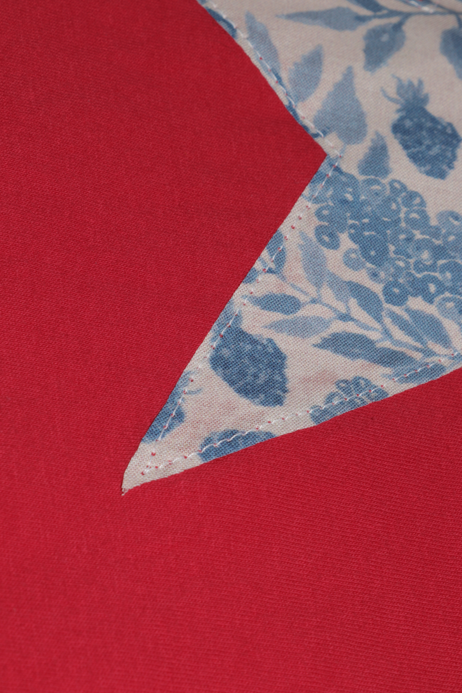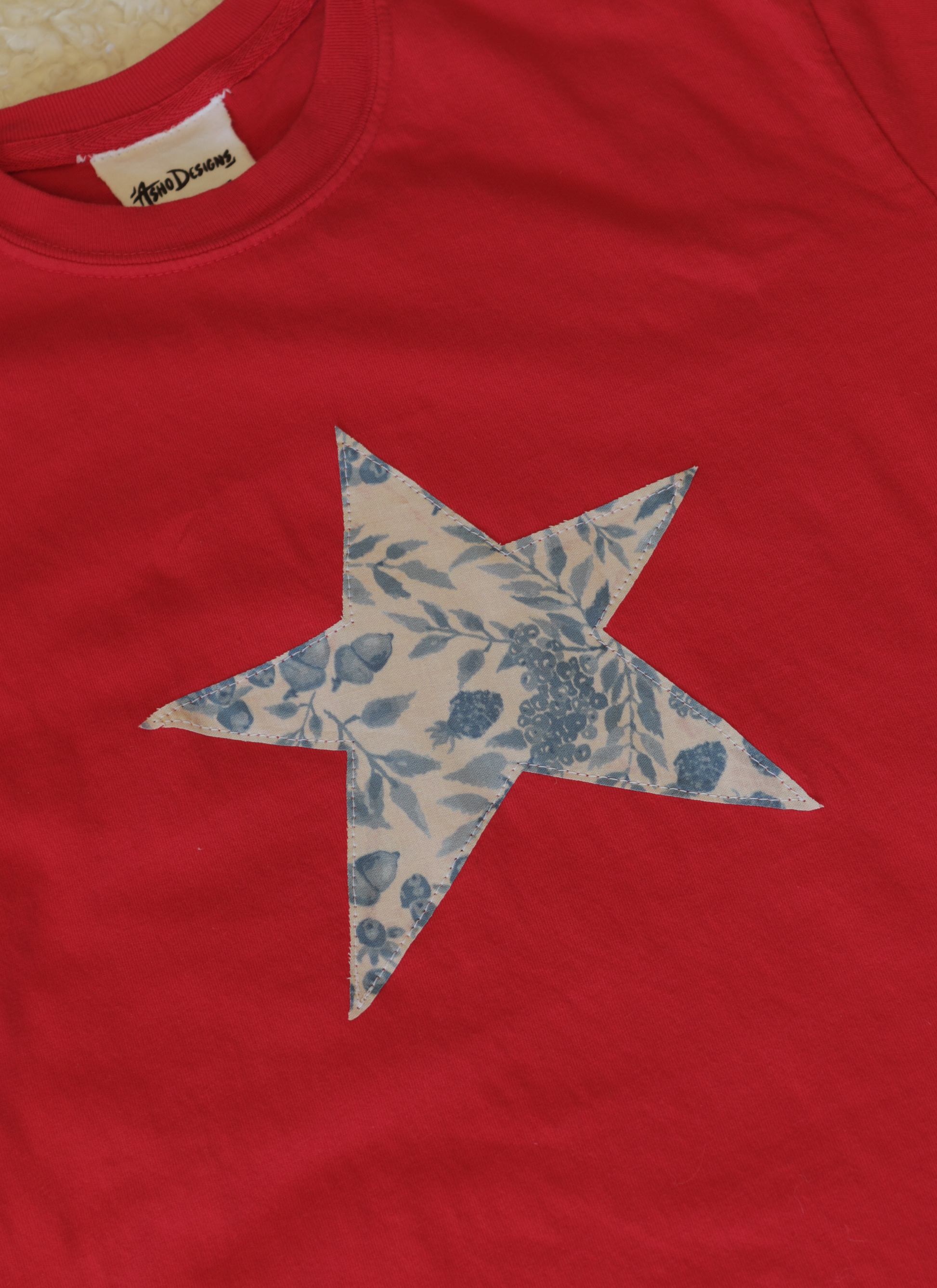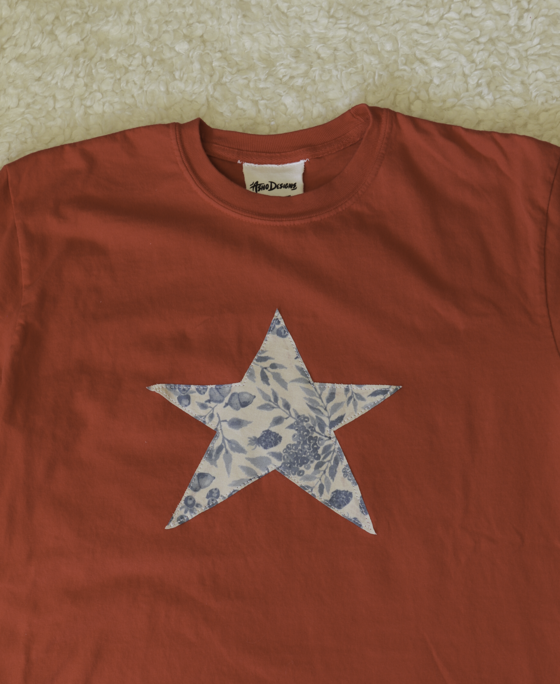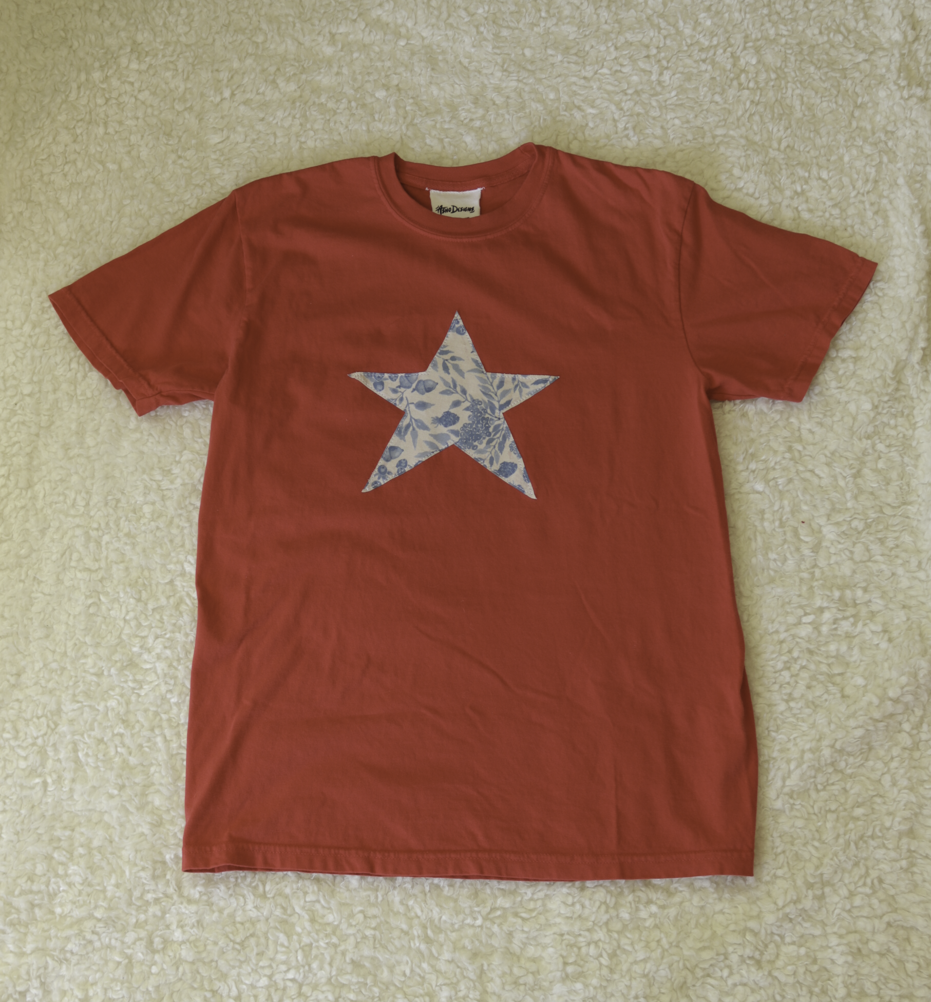 Unique, colorful, and comfy! This tee has a lot of personality in subtle way. The star is cut by hand, and has a berry pattern.