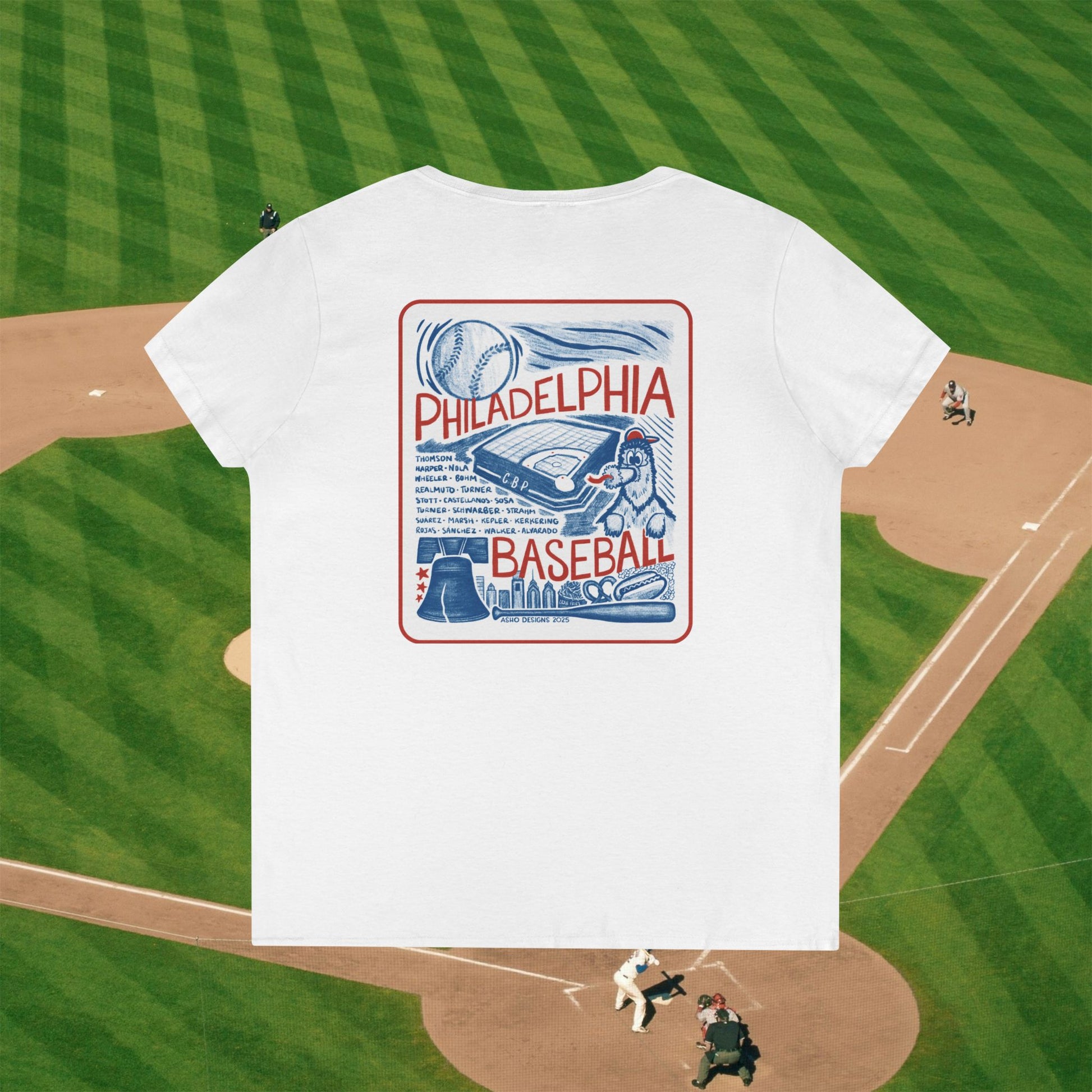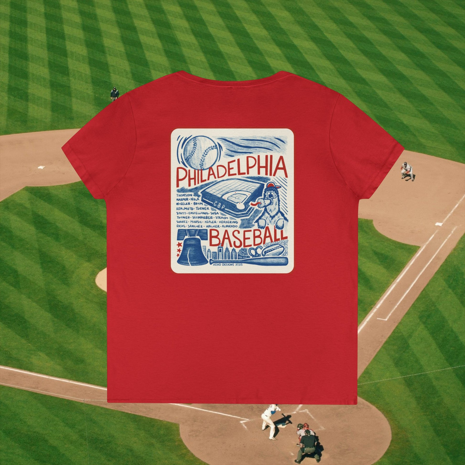 Introducing our chic V-Neck T-Shirt, perfect for casual outings or lounging at home. This stylish top combines comfort with a modern twist, making it an essential piece in any wardrobe. It's designed to flatter various body shapes, providing a semi-fitted look that feels effortless. Whether you're enjoying a sunny day at the park or attending a fun gathering, this t-shirt will keep you feeling relaxed and stylish. Ideal for baseball fans or anyone who loves Philadelphia, this shirt makes a thoughtful gift for birthdays, holidays, or just to celebrate your love for the city. Perfect for those looking to embrace a laid-back yet trendy vibe!