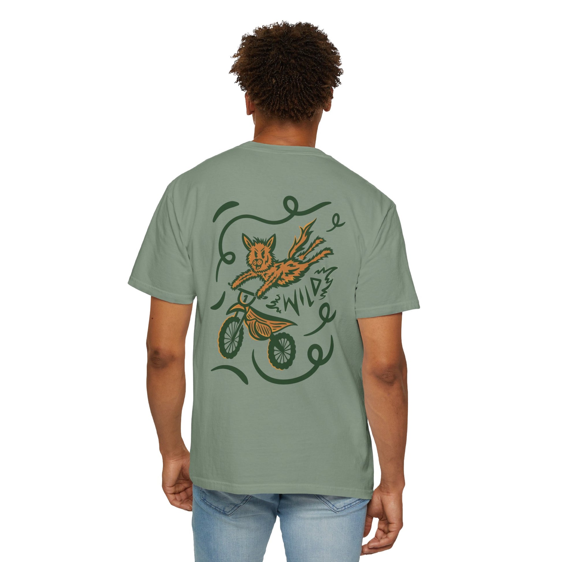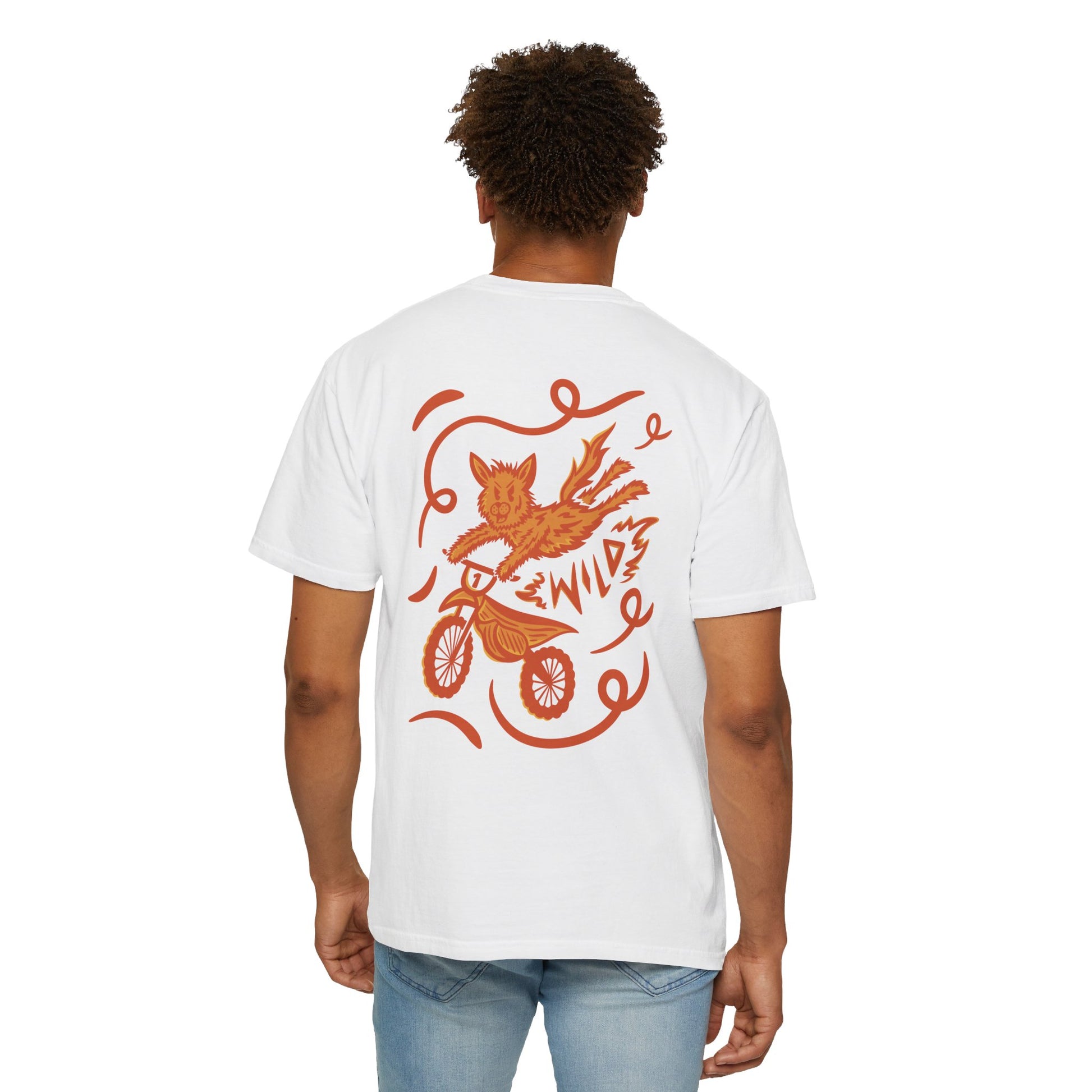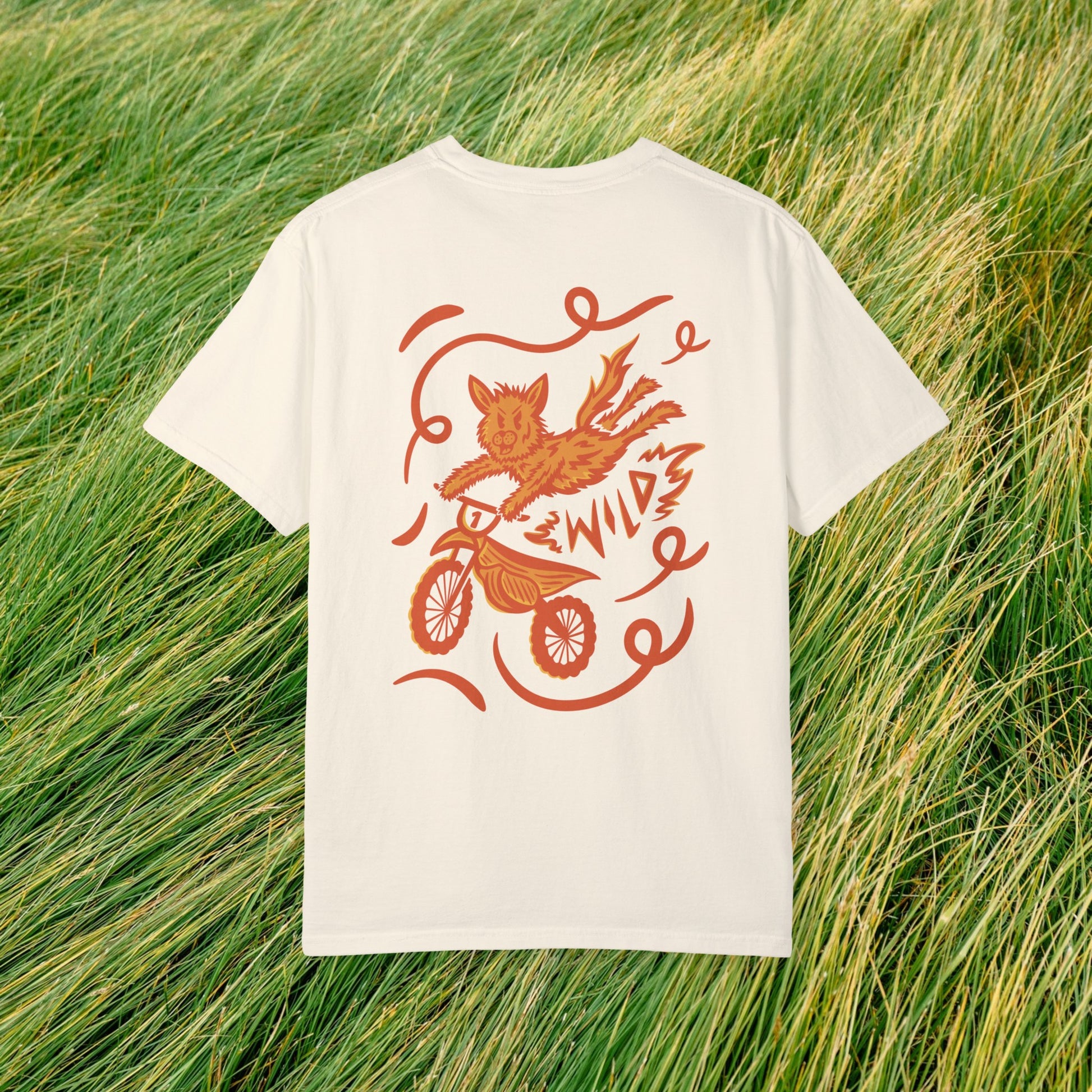 Unisex Wild Thing T-Shirt. This hand-drawn design features a retro looking, dirtbike riding, dog-fox creature.