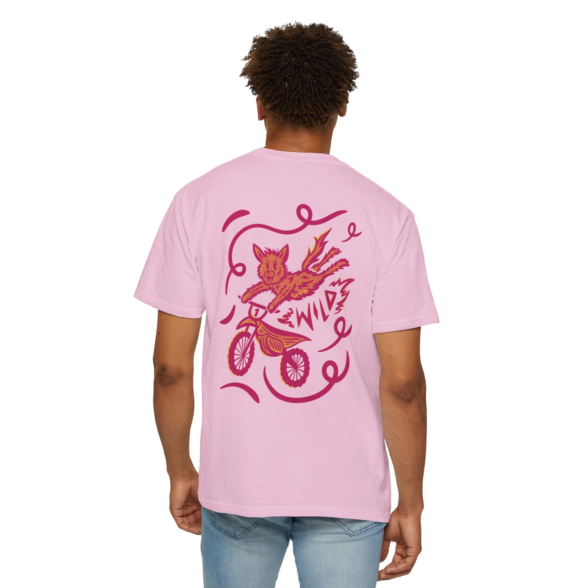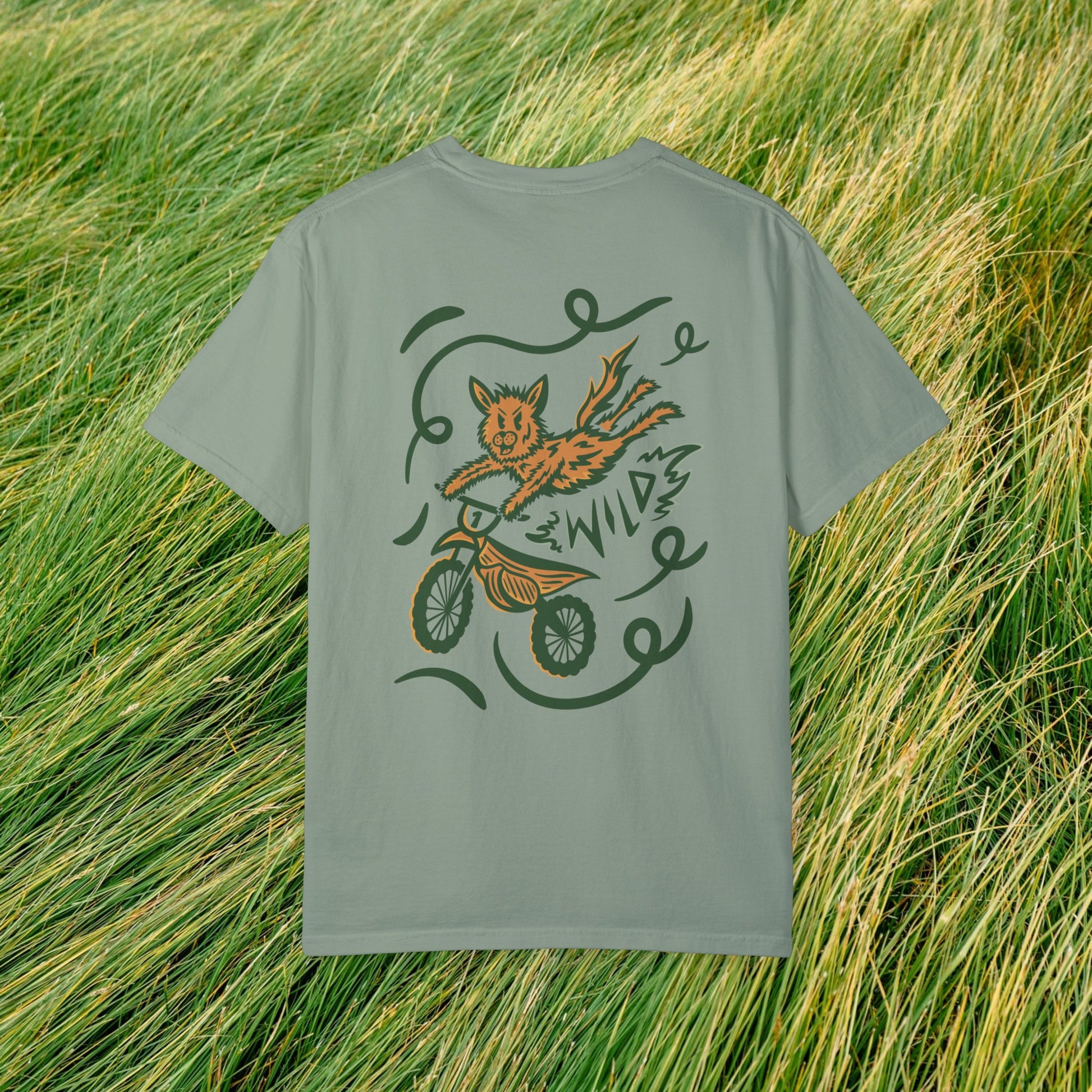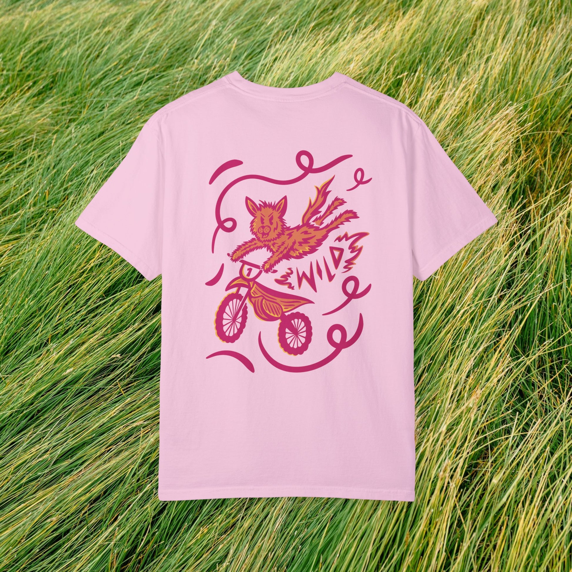 Unisex Wild Thing T-Shirt. This hand-drawn design features a retro looking, dirtbike riding, dog-fox creature.